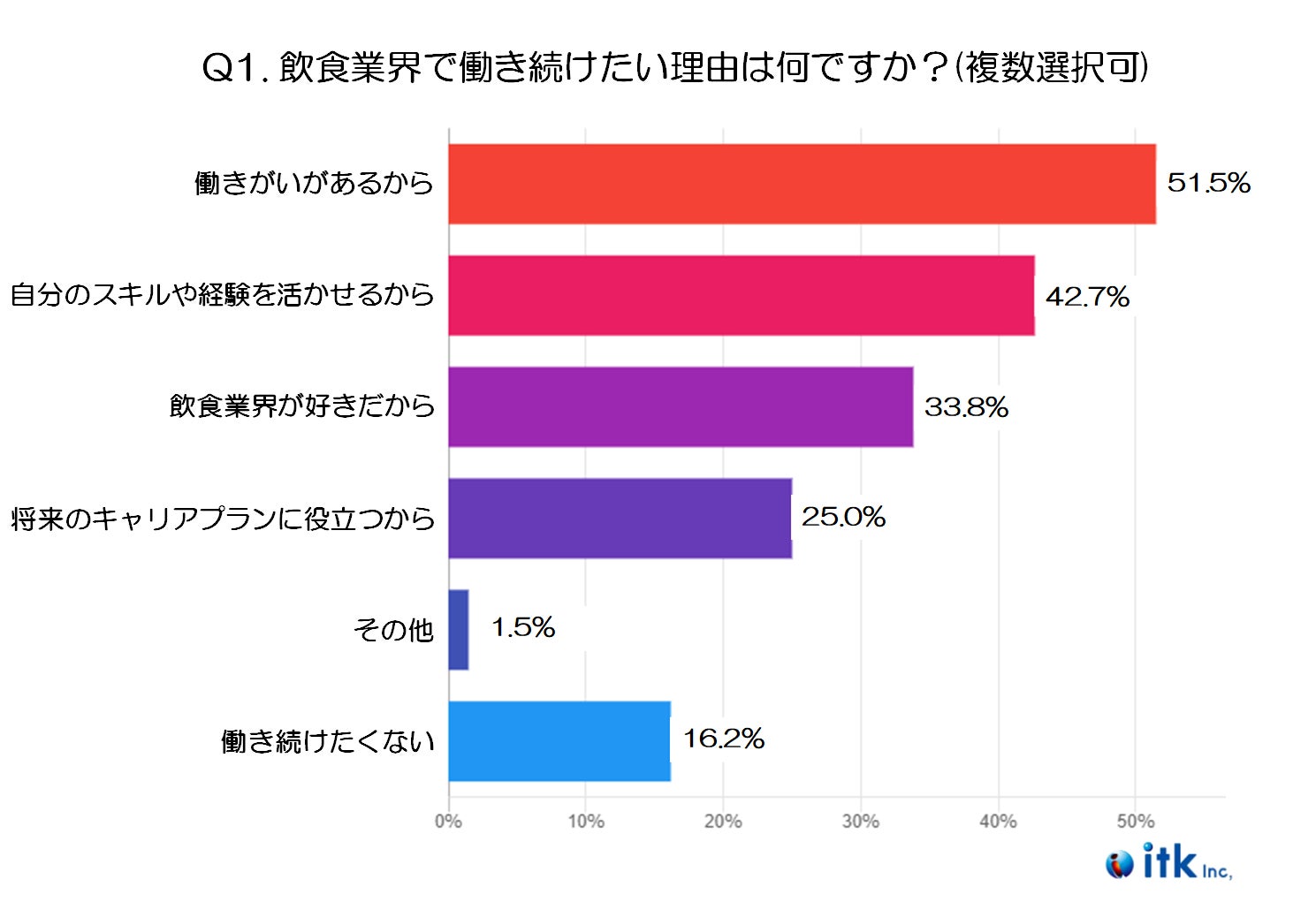 最も多かった回答は「働きがいがあるから」で、全体の51.5%を占めました。次いで「自分のスキルや経験を活かせるから」が42.7%、「飲食業界が好きだから」が33.8%と続いています。