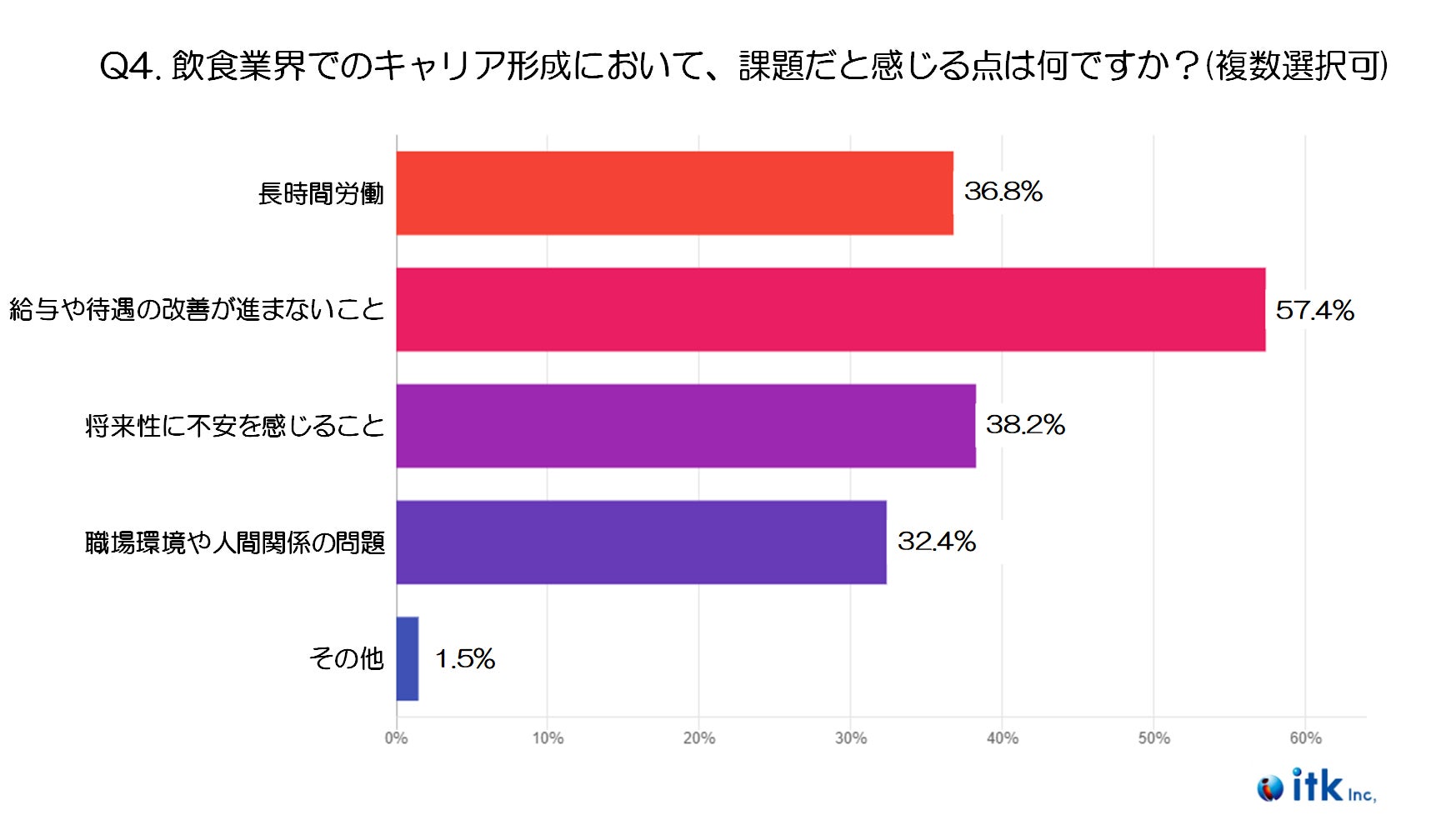 この結果から、飲食業界のキャリア形成において、多くの人が給与や待遇の改善の遅れを最大の課題と感じていることがわかります。