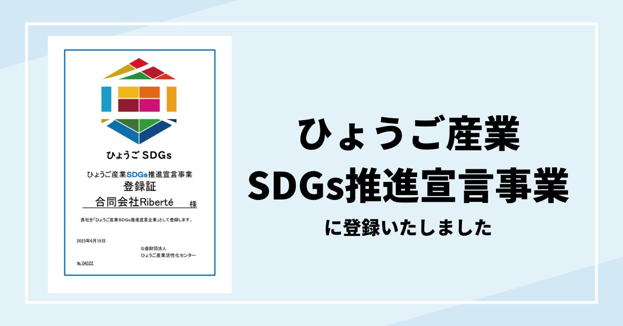 合同会社Riberte(本社:東京都中央区、代表者:森本翔、以下「当社」)は、ひょうご産業SDGs推進宣言事業に登録されました。本プロジェクトは、兵庫県内の中小企業に対し、SDGsの普及啓発を行うとともに、SDGsの達成に向けて取り組む中小企業を支援することを目的としています。