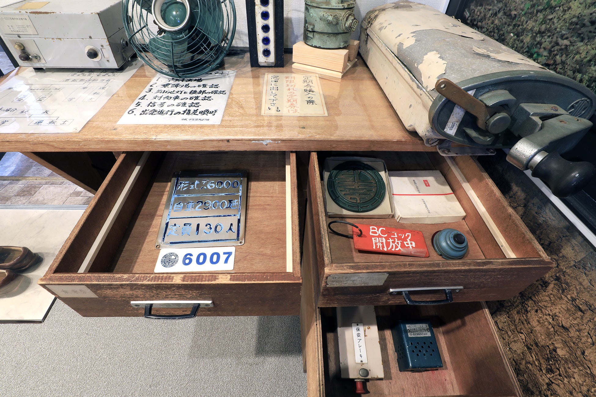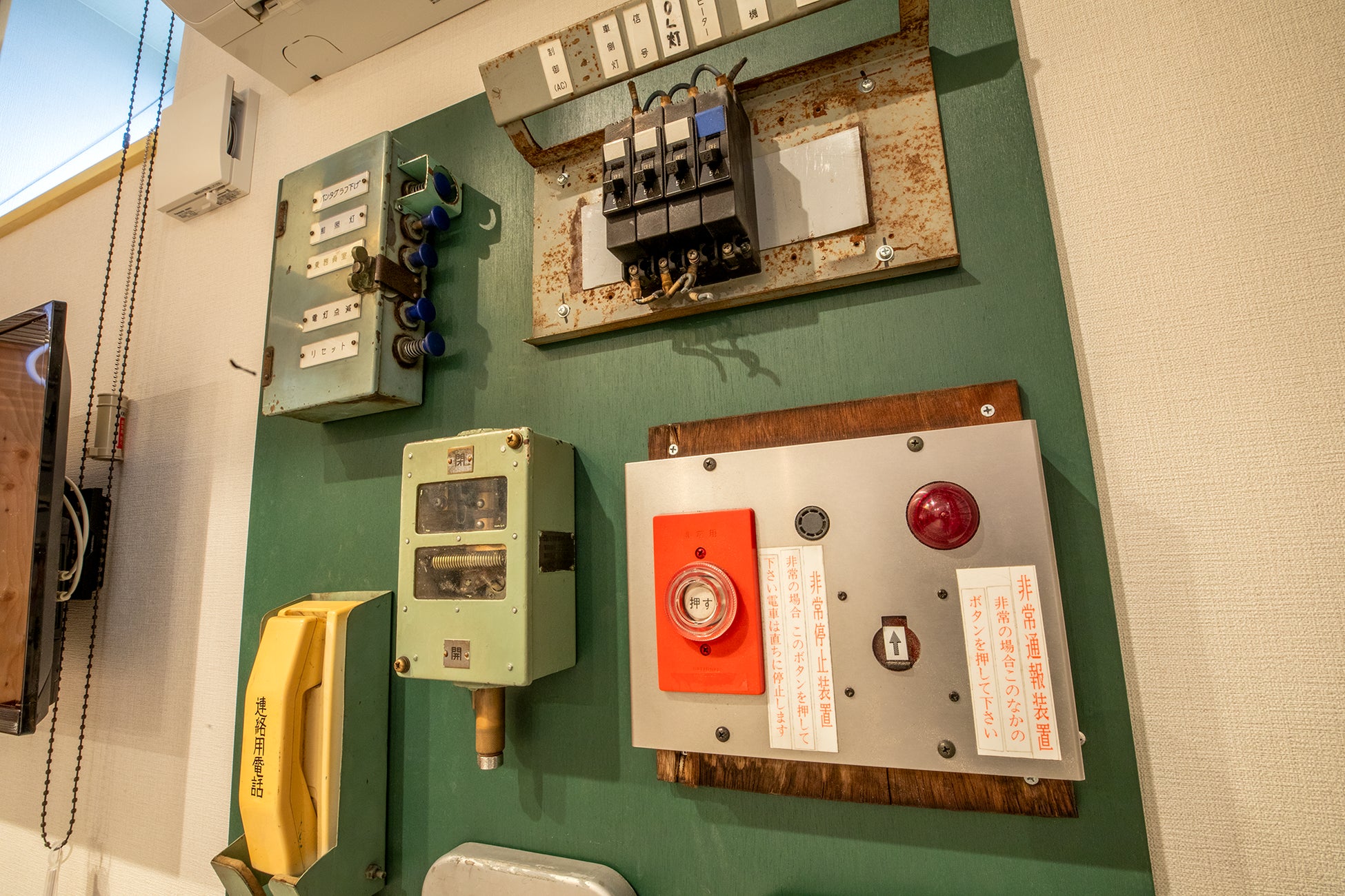 「6000系車内で使用されていた座席、荷物棚、手すりを組み立てて再現しており、ホテルの中なのにまるで乗車体験気分!? 無骨ながら懐かしさを感じるフォルムに触れてみてください。展示されている機器は実際に使われていたものばかりとなっています。連絡用電話や車掌用ドア開閉スイッチなど年季の入った機器に歴史が感じられます。室内には弘南鉄道弘南線と大鰐線の昔の様子がわかる貴重な写真も展示しています。現在とどこが変わったのか見比べてみると面白いかもしれませんね」