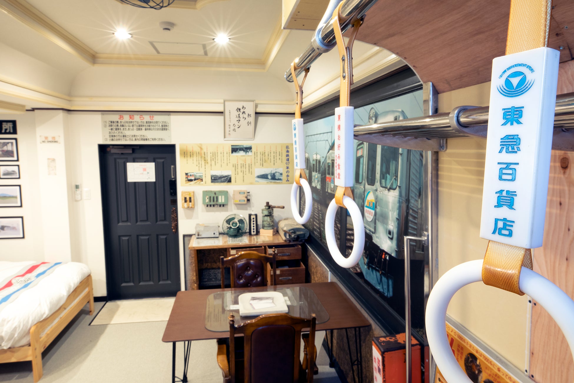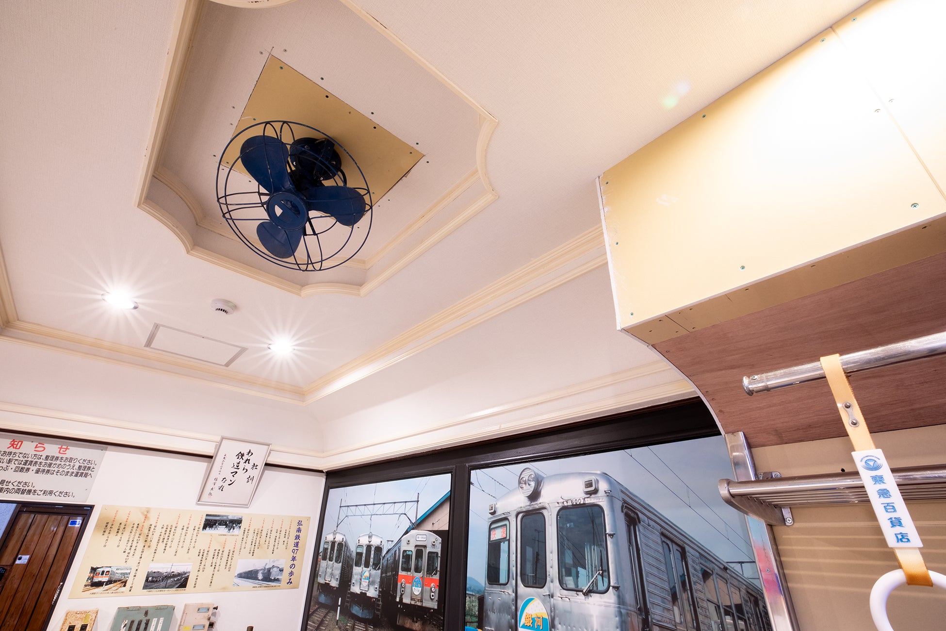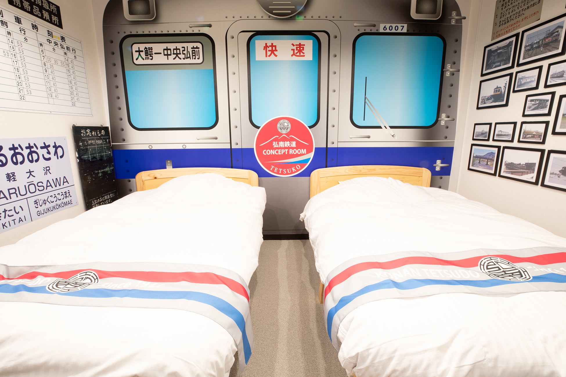6000系の車内を再現するために弘南鉄道株式会社が監修。鉄道ファンの心をくすぐるアイテムが詰まった客室になっています。