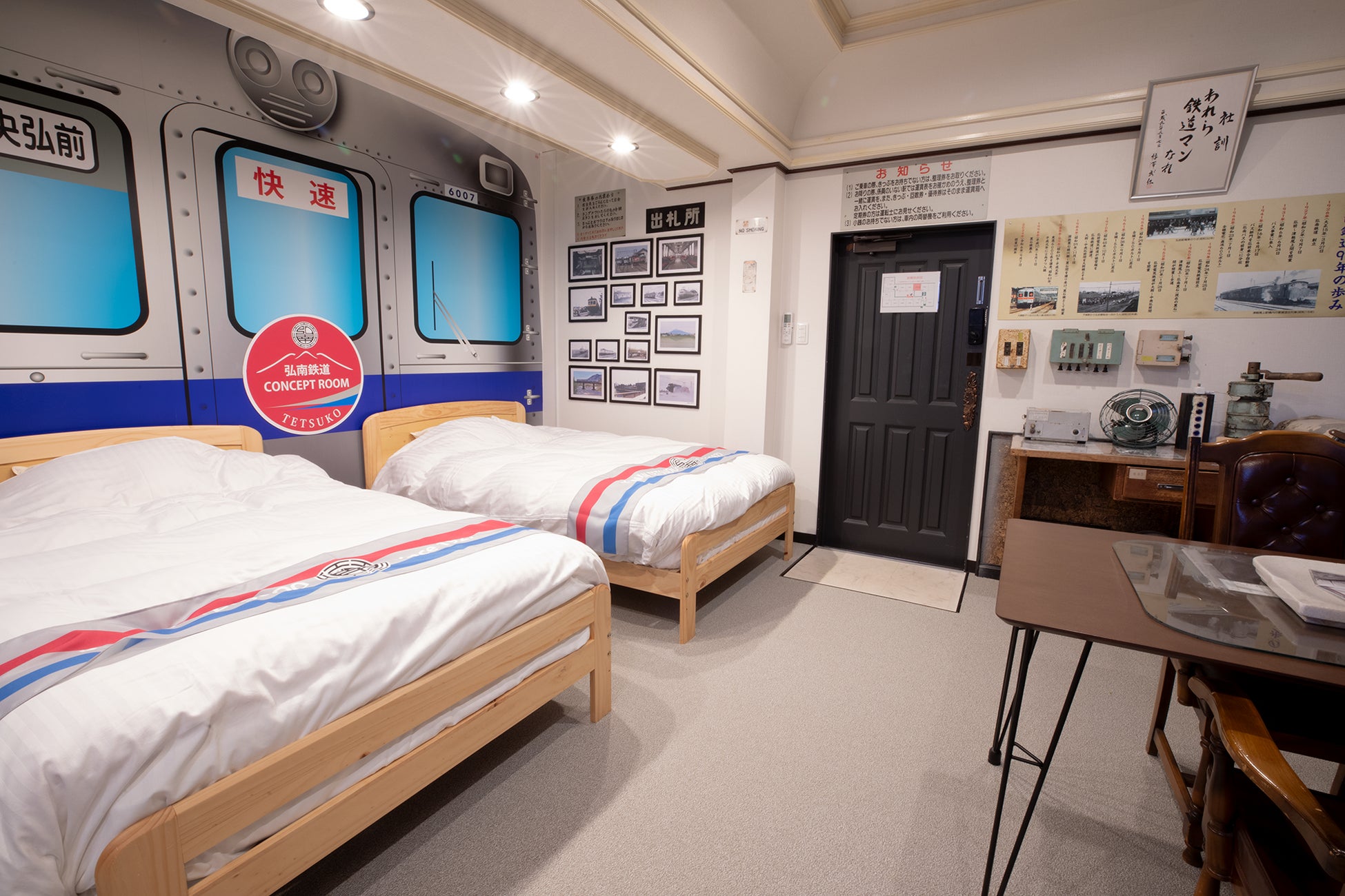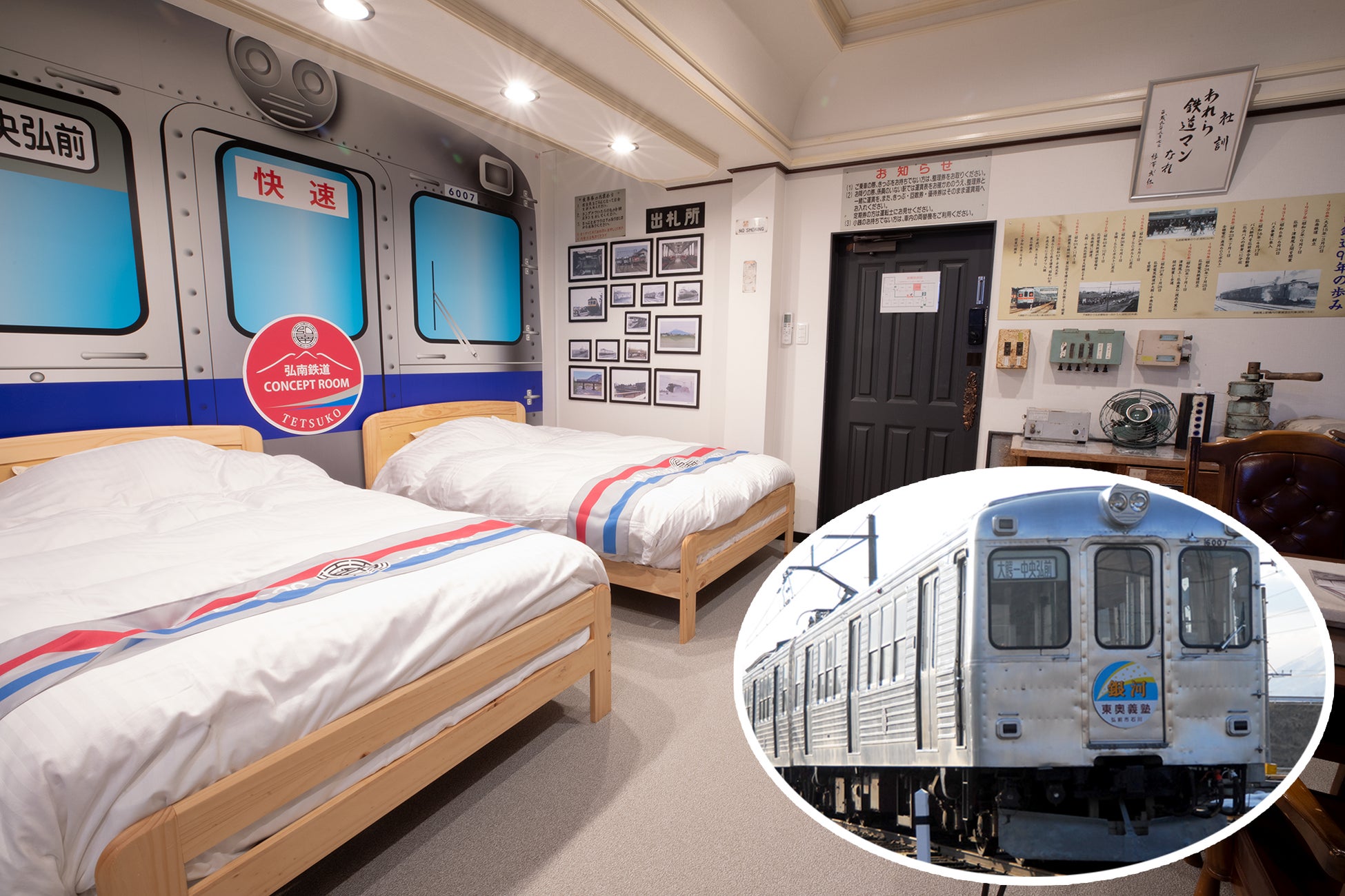 今回造成されるコンセプトルームでは、実際の運行時に車内で使用していた座席や荷物棚、看板などの備品、計器やヘッドライトなどの機器類を室内装飾に用いており、鉄道マニアにとっては必見の内容。ホテルでありながら、弘南鉄道の歴史に浸りつつ往年の車両に乗車しているかのような気分を味わえます。