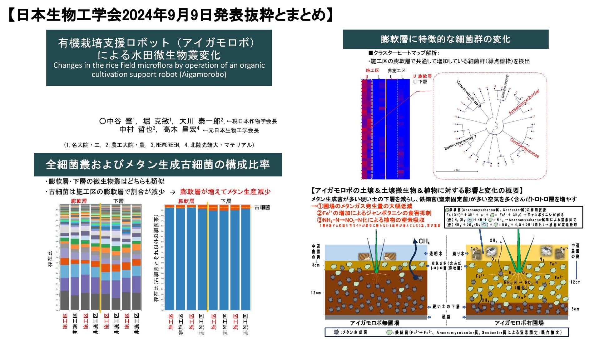 これまでアイガモロボを稼働した水田では、メタンガスが稼働開始から収穫時期まで大幅に低減されている傾向が確認されておりましたが、日本生物工学会での学会発表内容「有機栽培支援ロボット(アイガモロボ)による水田微生物叢変化」によって、そのメカニズムが明らかになってきました。