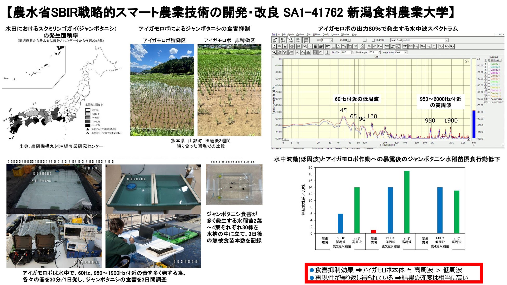 農水省SBIR戦略的スマート農業技術の開発・改良SA1-41762にて新潟食料農業大学等と共同で進めている「水田抑草ロボット『アイガモロボ』の機能高度化と運用最適化に資する農業生物学的およびロボット工学的研究」、および24年9月の日本生物工学会での学会発表内容「有機栽培支援ロボット(アイガモロボ)による水田微生物叢変化」によって、アイガモロボによる、ジャンボタニシの食害抑制のメカニズムが明らかになってきました。