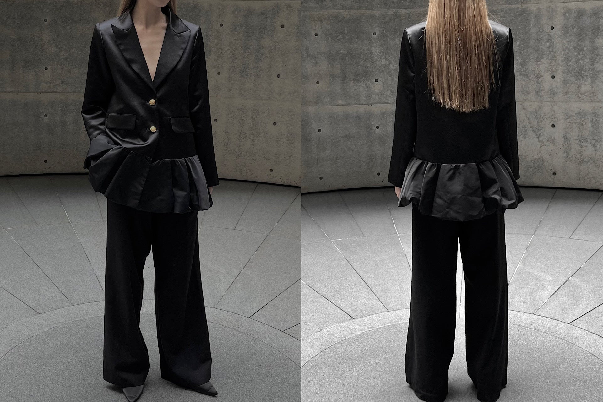 ジャケットの裾にバルーンシルエットを取り入れ、立体感とエレガンスを両立しています。