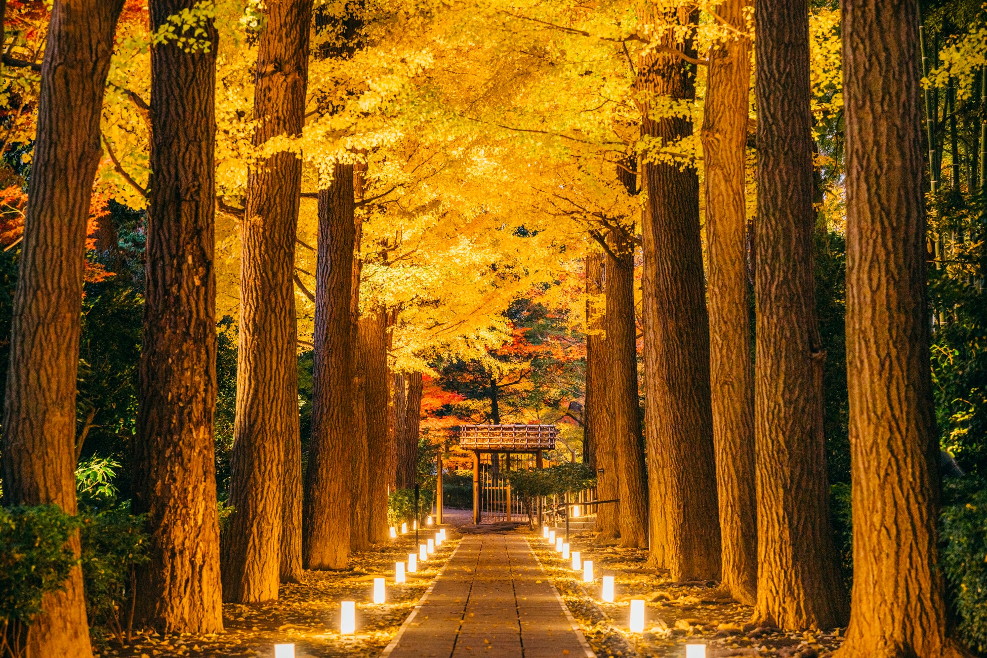 大田黒公園では、モミジや樹齢100年を超えるとされるイチョウ並木を中心に、園内を幻想的に照らしだすライトアップイベントを今年も開催いたします。色づいたモミジが園内の小川や池の水面に映り込む景色は、息をのむほどの美しさです。