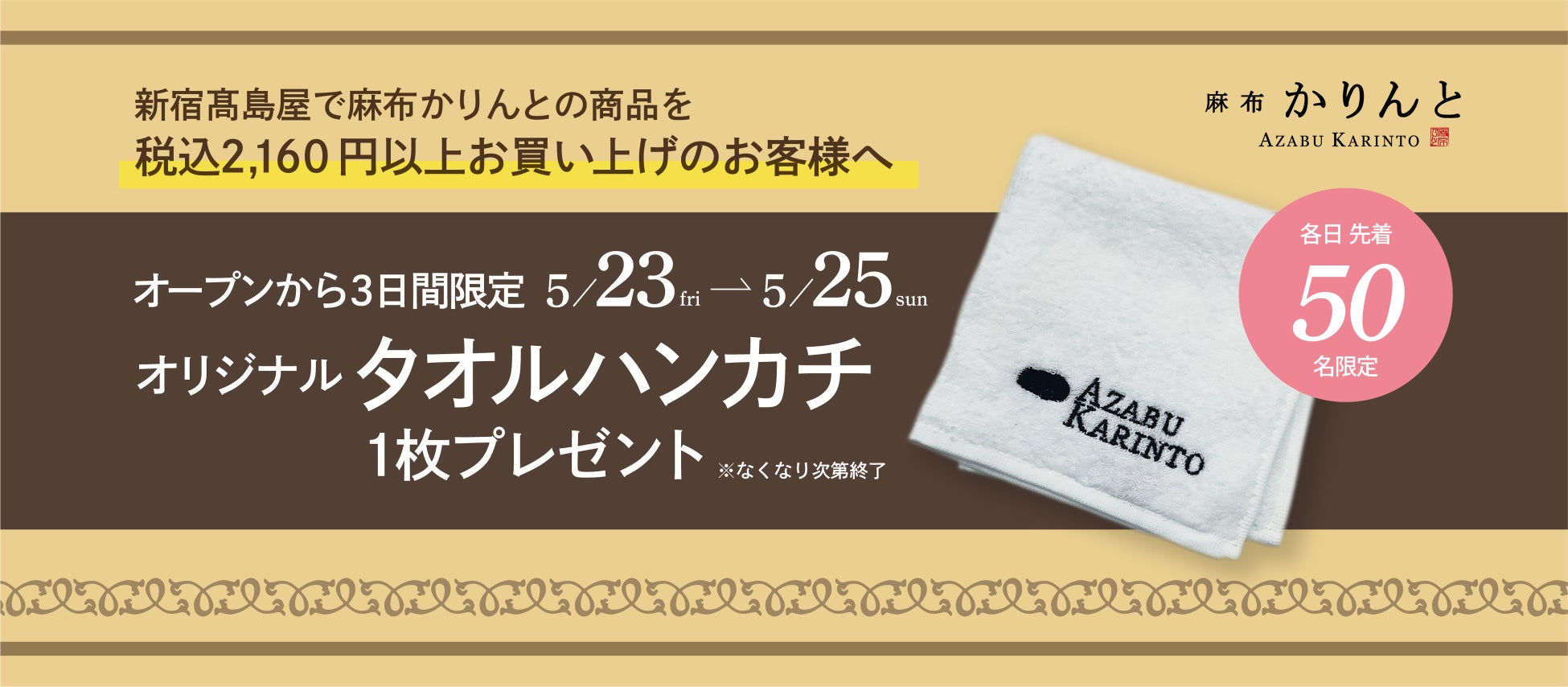 「麻布かりんと」オリジナルタオルハンカチを1枚プレゼントいたします。