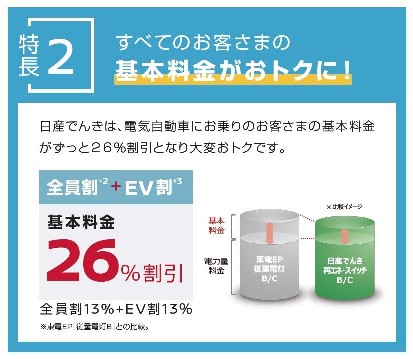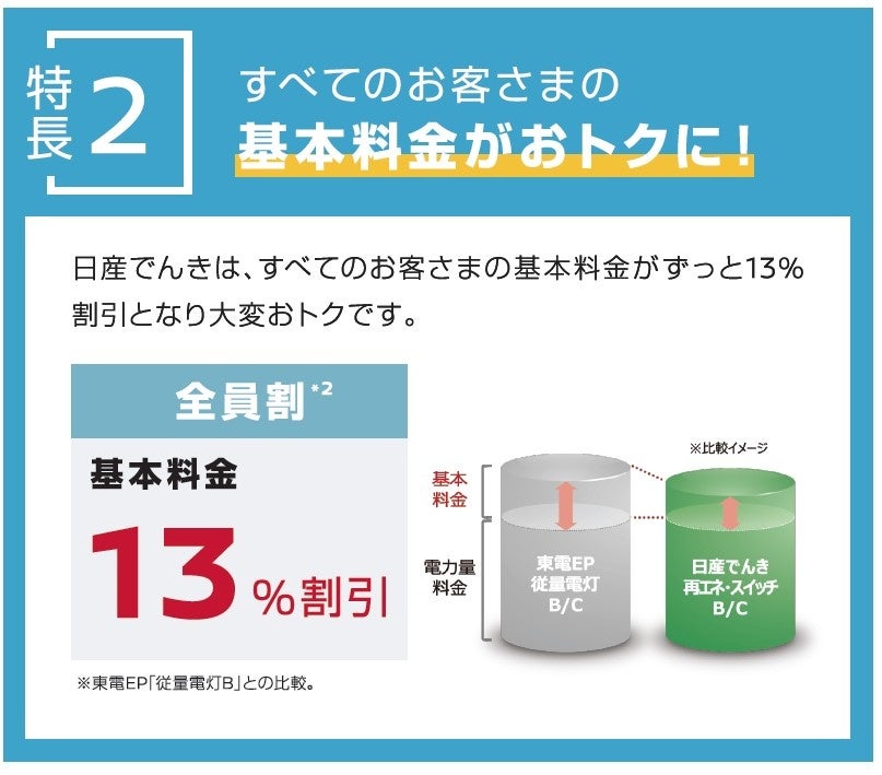 ・全員割:日産でんき(再エネ・スイッチBまたはC)にご加入の方を対象に、ご契約期間中、基本料金から毎月13%(税込)割引いたします。