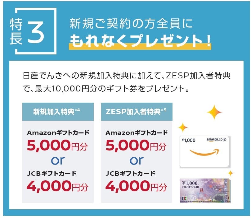 ※5 ZESP加入者特典:ZESP3(日産ゼロ・エミッションサポートプログラム3)にご契約済みの方、新規ご加入の方で、お申込時にZESP会員番号を入力いただき確認ができたお客さまに「Amazonギフトカード5,000円分(デジタルギフト)」または「JCBギフトカード4,000円分」を進呈いたします。日産でんき使用開始日から6カ月間のご契約継続が条件となります。尚、日産でんき新規お申込みの場合は、使用開始日から6カ月後の進呈となります。