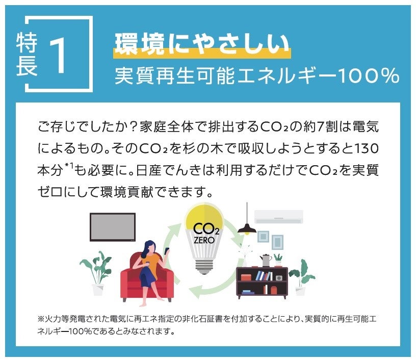 日産自動車は、カーボンニュートラル社会の実現に向けて他社に先駆け電気自動車の普及に務めて参ります。そして今回、日産自動車が新たにご提供するのは、FIT発電所由来のFIT非化石証書※6を付すことで、実質的に再生可能エネルギー100%※7の環境に配慮した電力「日産でんき」です。日産でんきにご加入いただくことにより、ご家庭で使用する電気によって排出されるCO₂を実質ゼロに抑えることが可能になり、これまでと変わらない暮らしが、環境に優しい暮らしに変わります。