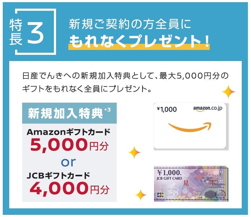 ※4 新規加入特典:日産でんき(再エネ・スイッチBまたはC)に新規ご加入のお客さまに、「Amazonギフトカード5,000円分(デジタルギフト)」または「JCBギフトカード4,000円分」を進呈いたします。日産でんき使用開始日から6カ月間のご契約継続が条件となります。尚、日産でんき新規お申込みの場合は、使用開始日から6カ月後の進呈となります。