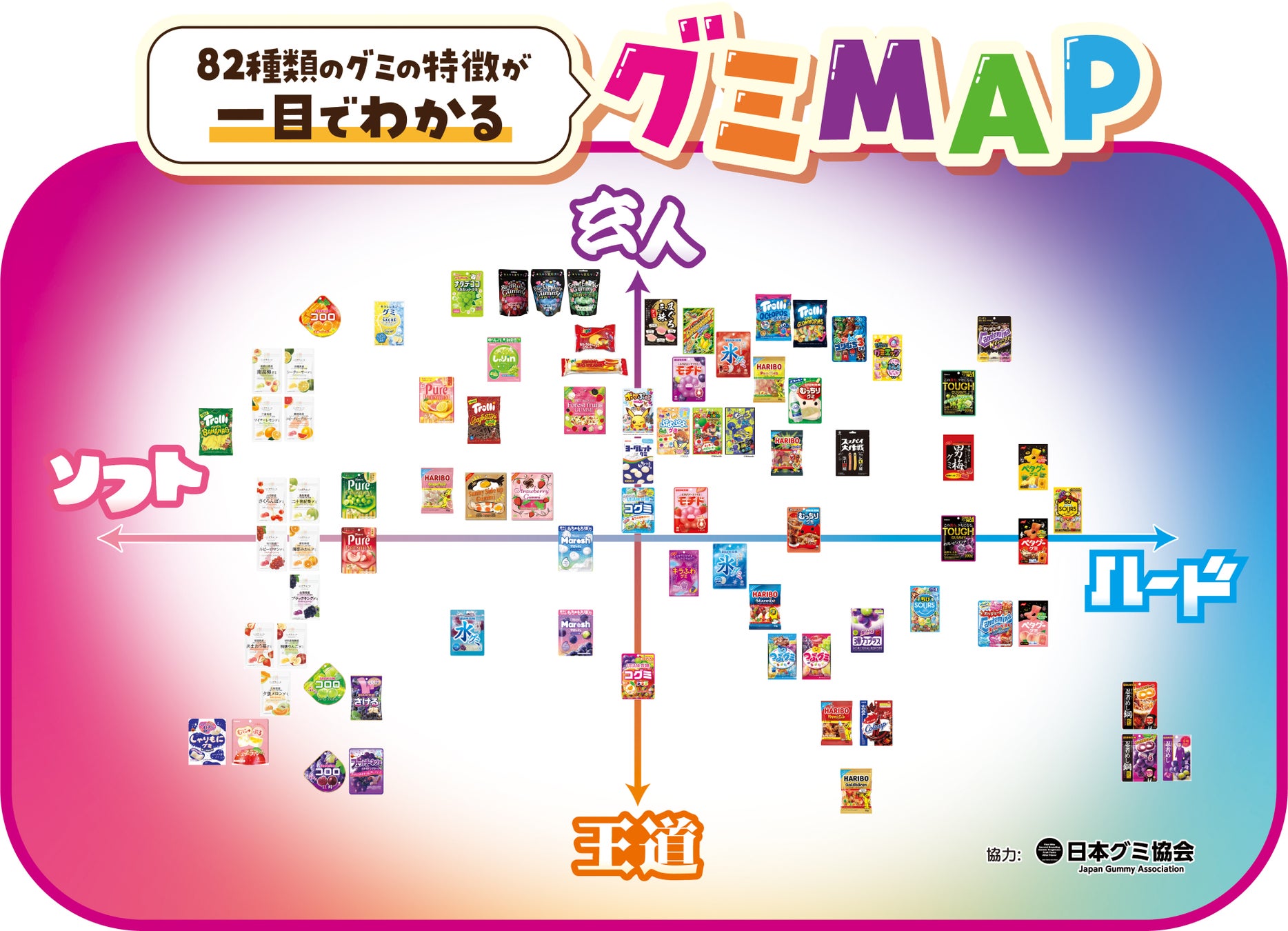 また「日本グミ協会」様にご協力をいただき、様々なグミの特徴について分類した「グミMAP」を本イベント専用に作成。今までにない食感や珍しいグミなど、特徴ごとに分類されたグミMAPで、多種多様なグミの中から自分好みのグミを見つける楽しさを味わってみてください。