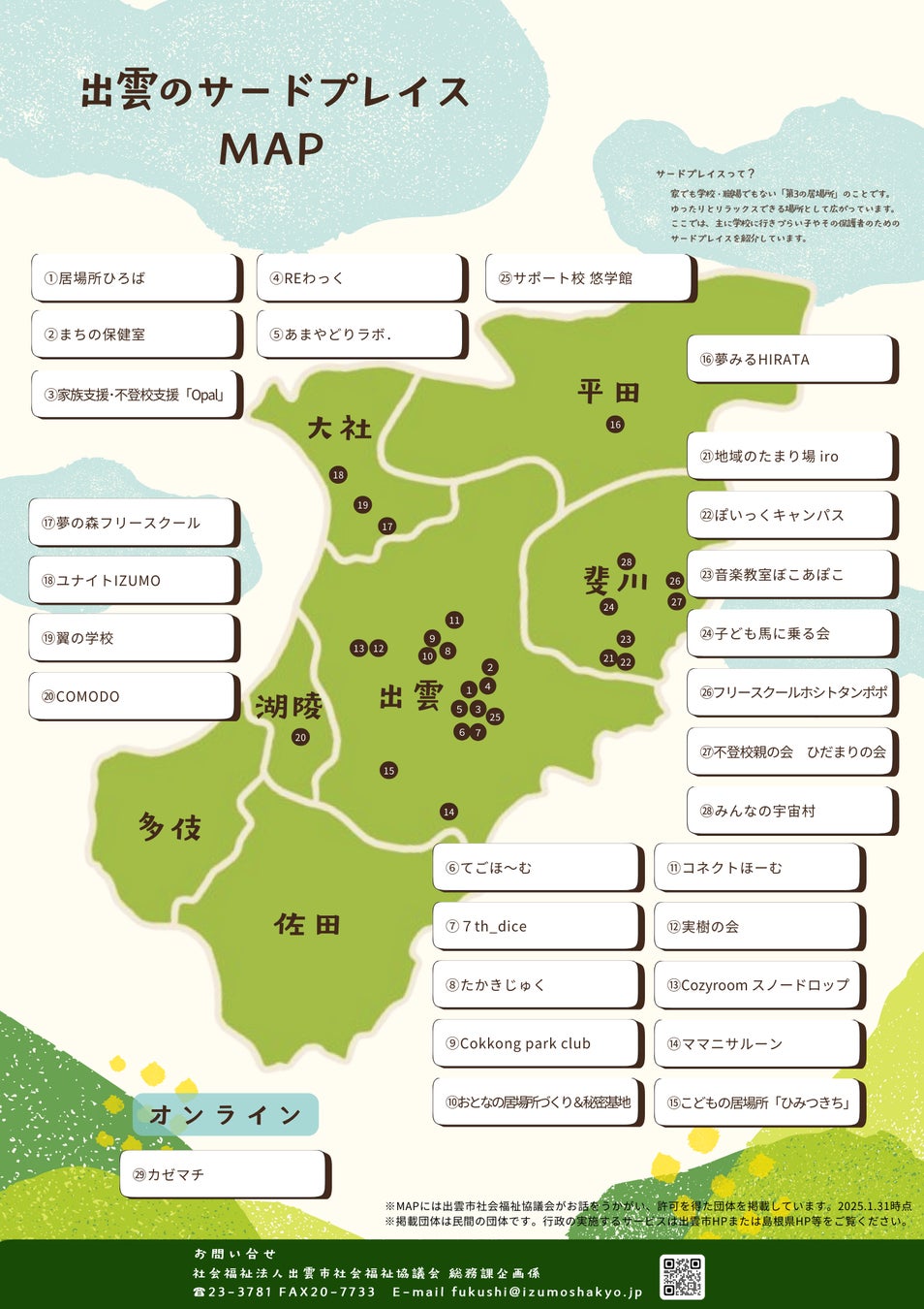 社会福祉法人出雲市社会福祉協議会は、出雲市とともに、公的な制度やサービスにつながらない生活課題に対応する「出雲市福祉総合相談支援事業」を実施しております。そのなかで増加しているひきこもりや不登校に関するケースの解決に向けて、家でも学校でもない第3の居場所(サードプレイス)を紹介する「出雲市サードプレイスMAP」を作成し、2月6日(木)より出雲市社会福祉協議会公式サイトやFacebook、Instagramにて公開を開始いたしました。また、窓口でも配布しております。