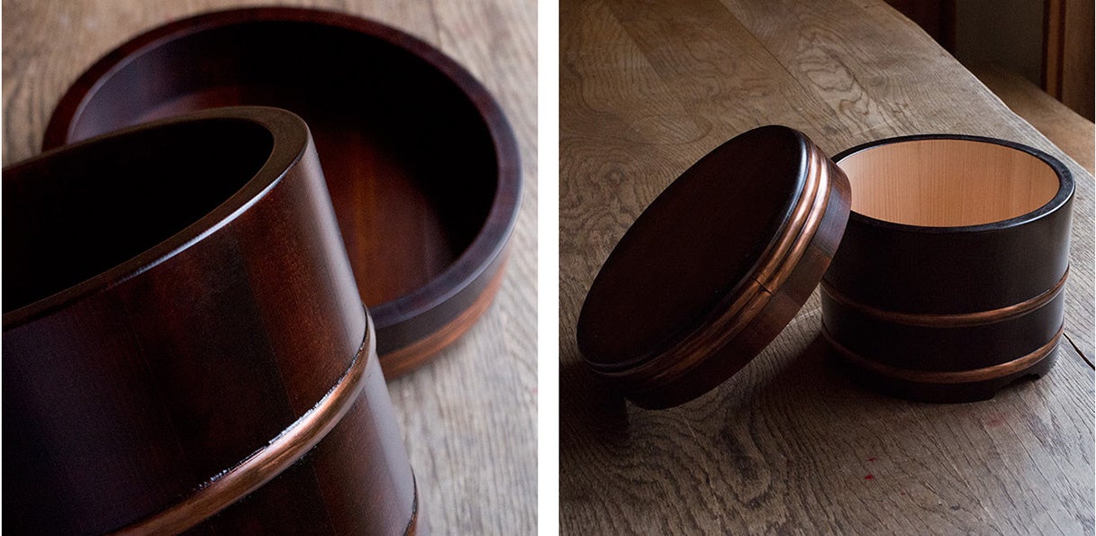 木曽で採れた天然サワラで組んだおひつを、丁寧に7回摺り漆しました。桶の表面がウルシの膜で覆われているため汚れにくく、薄い膜の木地が水分を吸収します。サワラおひつは、ご飯を美味しく保つ機能も兼ね備えています。