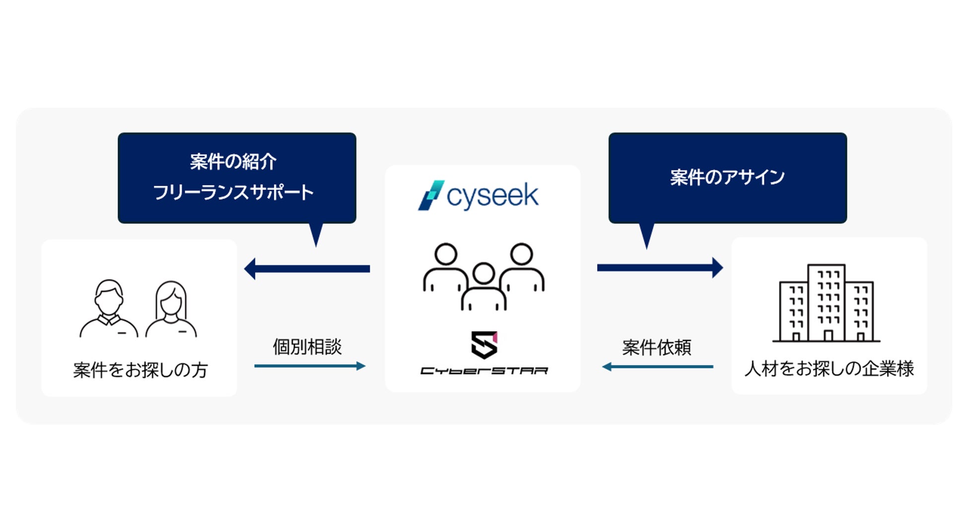 cyseekを運営するCyberSTARはセキュリティ人材に特化したSES事業を展開しており、多種多様な案件に対し、最適な人材をアサインしてきた実績があります。幅広い業務内容・規模に応じて、CyberSTARの専任者が目利きを行い、セキュリティエンジニアを募集する企業様のニーズと案件を探すフリーランスエンジニア様のニーズを合致させ、最適な案件アサインを実現します。