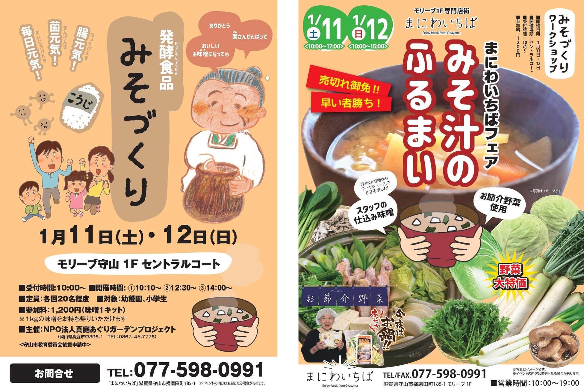 さらに、「まにわいちばフェア」として、真庭市の新鮮な野菜の販売と、昨年のワークショップで仕込んだみそと「お節介野菜」を使ったみそ汁をふるまいます。