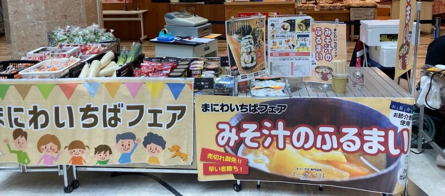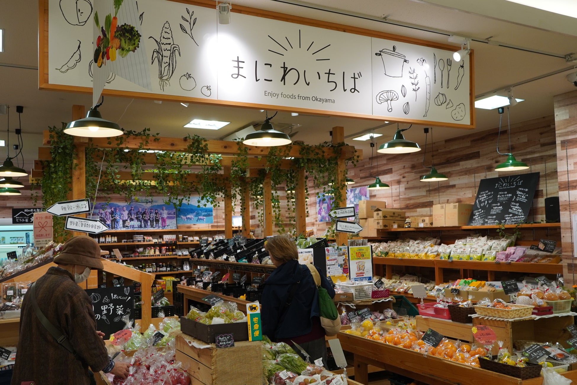 「まにわいちば」は、商業施設「モリーブ」の1階にあり、岡山県の最北端に位置する真庭市から毎朝直送される新鮮な野菜・果物・生花や加工品などを販売する産直市場です。