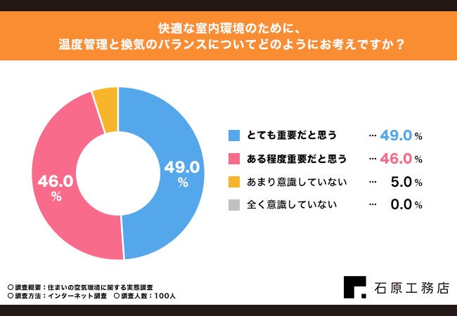 最後に「快適な室内環境のために、温度管理と換気のバランスについてどのようにお考えですか?」と質問したところ、「とても重要だと思う」と回答した人が49.0%、「ある程度重要だと思う」と回答した人が46.0%と、合わせて95.0%の方が温度管理と換気のバランスを重要だと考えていることがわかりました。