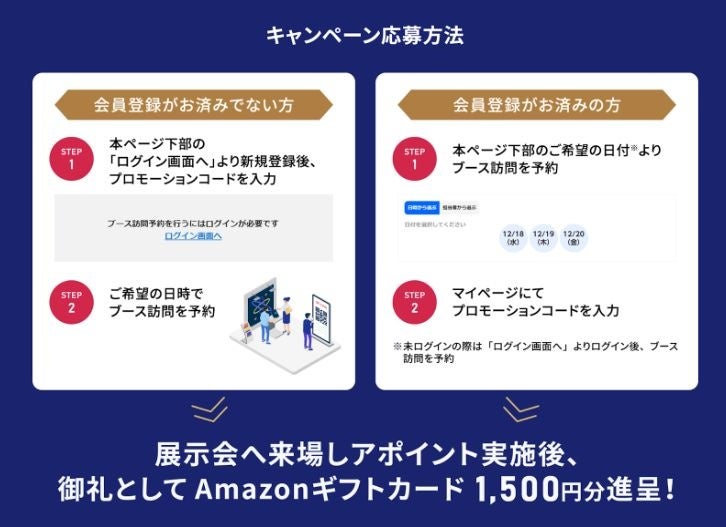 ・プロモーションコードの入力漏れや、ブース訪問予約をせずに当日訪問された場合など、いずれかの条件を満たさない場合は進呈できませんのでご注意ください。