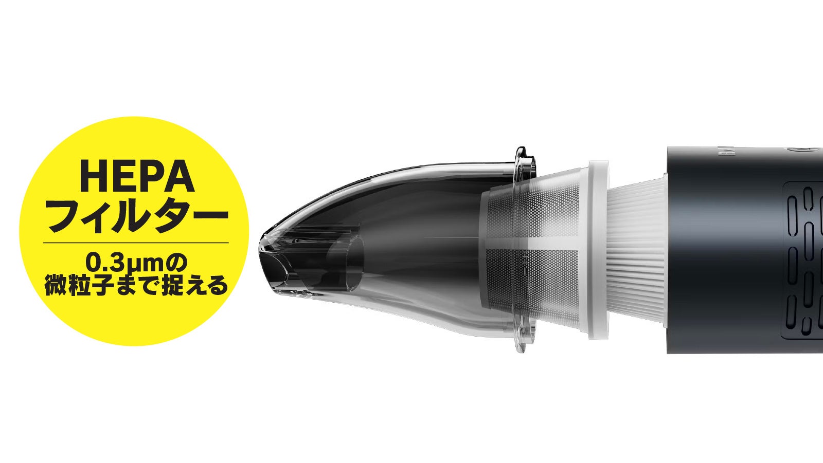 吸い込んだ空気はステンレスフィルターと、0.3 µmの微粒子まで捉えるHEPAフィルターのダブルでブロック。