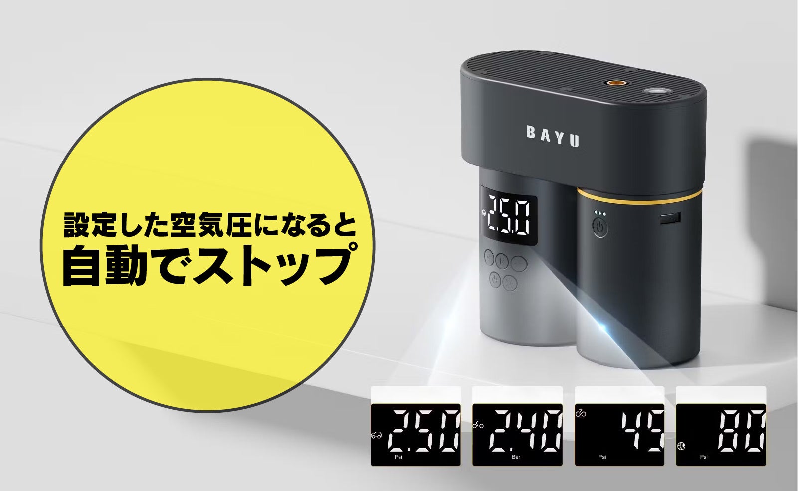 電動空気入れには空気圧の測定と、注入する空気圧を指定できるインジケーターがあるので、設定した空気圧で注入を自動でストップ。