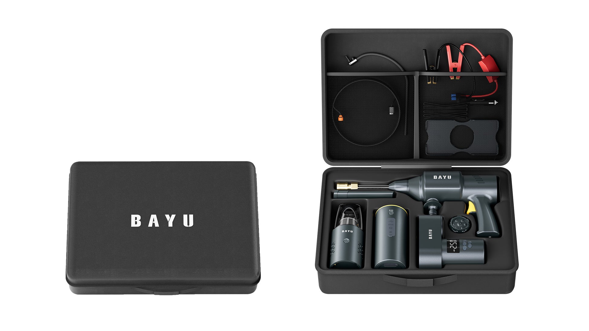 小型で高出力のパワーバンクをベースに、愛車の整備に必要なジャンプスターター、電動空気入れ、ハンディクリーナー、高圧洗浄機がセットになった5in1のメンテナンスキット。一つで面倒な車のメンテナンスも完結