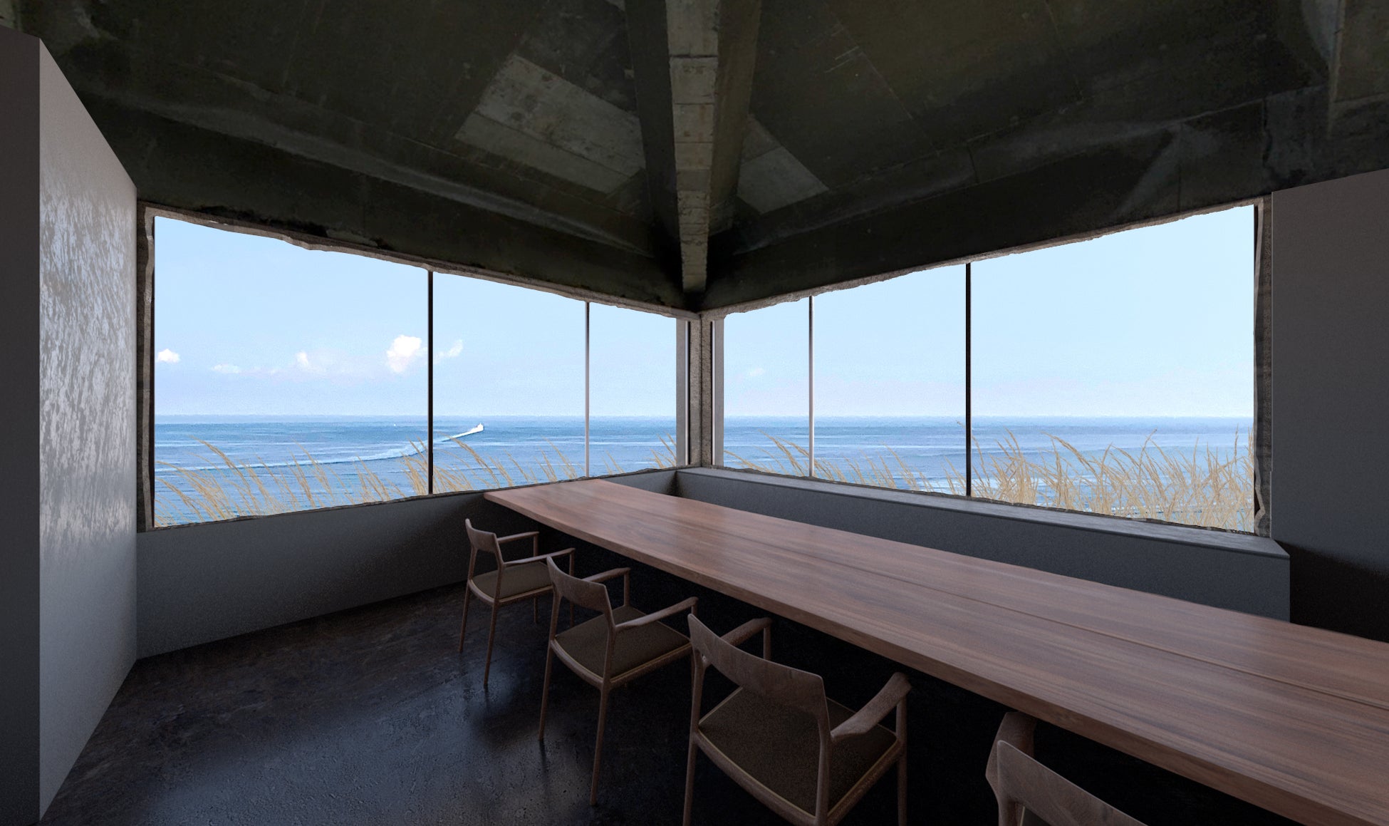 長期間海風にさらされ風化している素材もどこか愛しげに思えるような、そんな建築として生まれ変わることを想像しながらつくっています。時間が経って古くなった部分と、新しく手を入れた部分が均衡し、この風景と等価となる空間をぜひ体感していただければと思います。