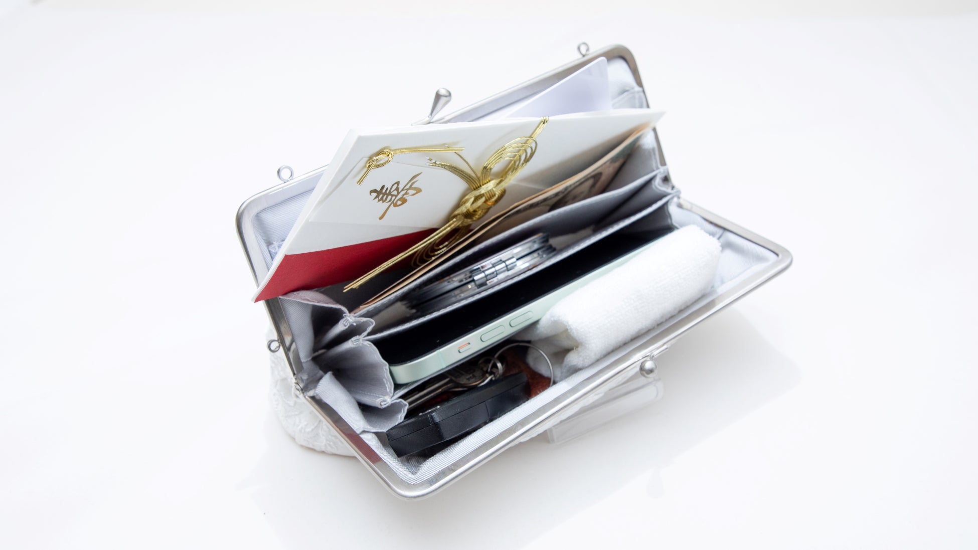 〇見た目はコンパクトながら大容量。マチを広く取っていますのでスマホやスマートキー等もすっぽりと収納できて、小さめの祝儀袋も収納できます。