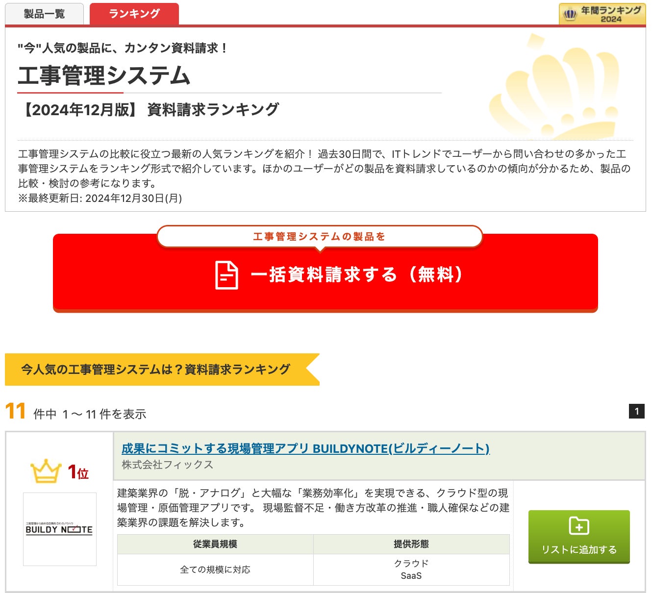 建築業向けクラウド型業務管理アプリ「BUILDY NOTE」がIT製品の比較・資料請求サイト「ITトレンド」の工事管理システム部門における、2024年12月の資料請求数ランキングで1位になりました。