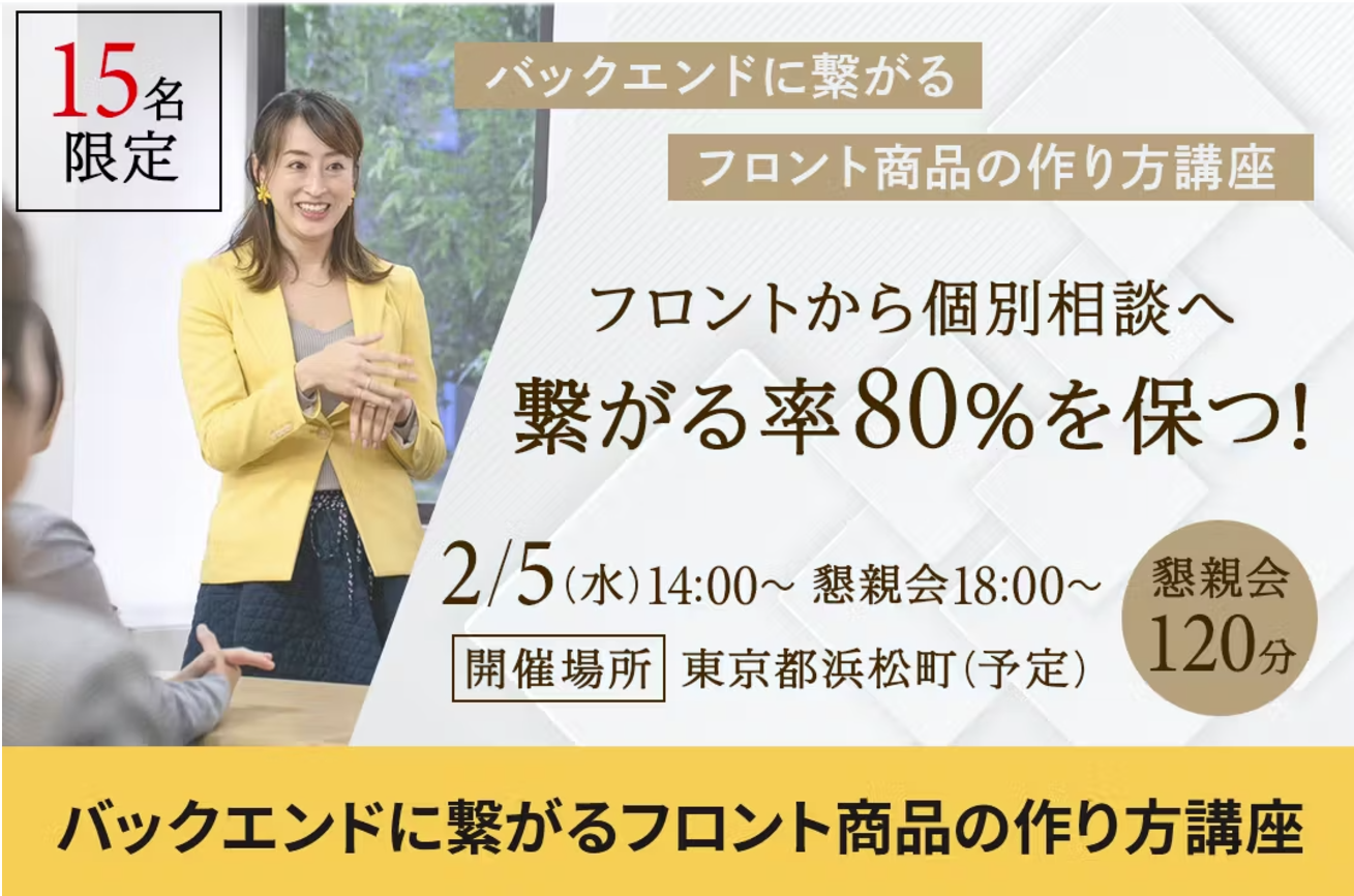 15名限定でLeverage your Value Japan 代表の朝見由実が開催する対面講座に参加できる権利です。 フロントから個別相談へと繋がる率80%を保てるフロントの構成をレクチャーします。