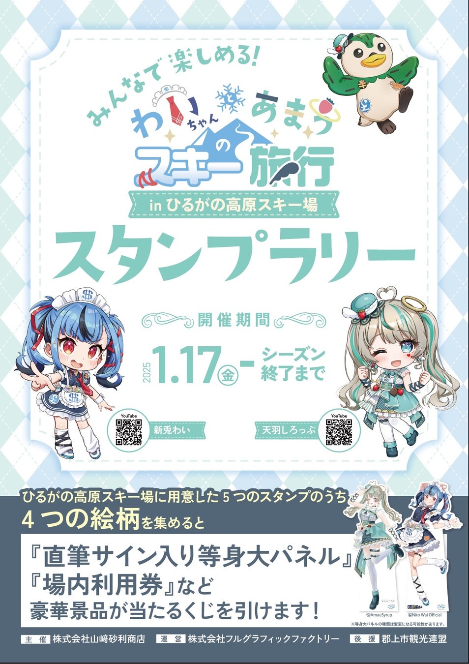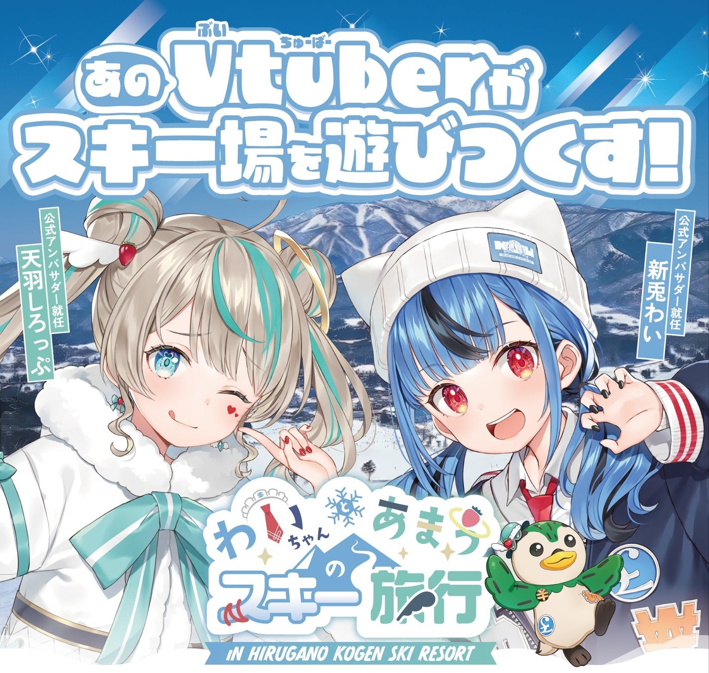 岐阜県郡上市高鷲町に位置する「ひるがの高原スキー場」が、本日より3月下旬までの約2ヶ月間、大人気VTuber「新兎わい」と「天羽しろっぷ」とのコラボイベント「わいちゃんとあまうスキー旅行」を開催いたしました。