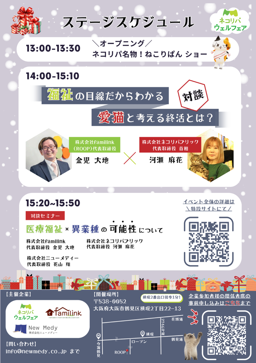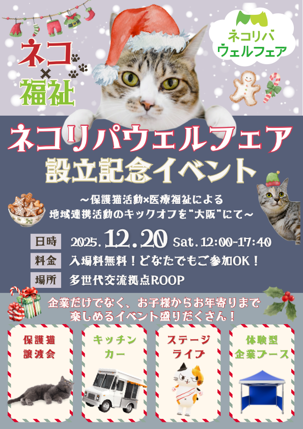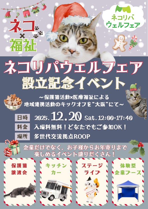 株式会社familink(本社:大阪府大阪市鶴見区、代表取締役:金児大地)は、株式会社ネコリパウェルフェア(本社:東京都台東区、代表取締役:河瀬麻花)、株式会社ニューメディー(本社:愛知県名古屋市中区、代表取締役:花山翔 ネコリパウェルフェア関連企業)、さらに全国にて保護猫活動を展開する株式会社ネコリパブリック(本社:東京都杉並区、代表取締役:河瀬麻花 ネコリパウェルフェア関連企業)と連携し、保護猫×医療福祉で「猫助け」で「人助け」を実現するネコリパウェルフェアの「設立記念イベント」を2025年12月20日(土)、多世代交流拠点「ROOP」にて開催いたします。