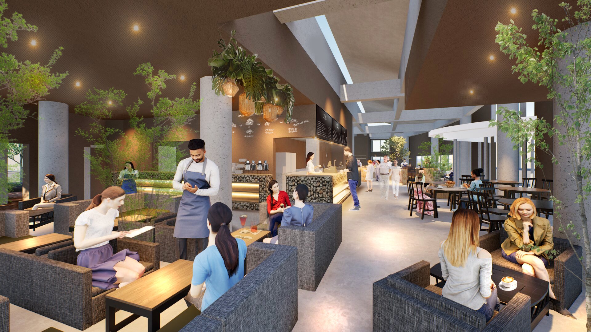 屋内施設では、上質なラウンジ空間のカフェ地産地消をテーマに淡路島を感じるオリジナルスイーツをはじめとしたフード&ドリンクを提供します。