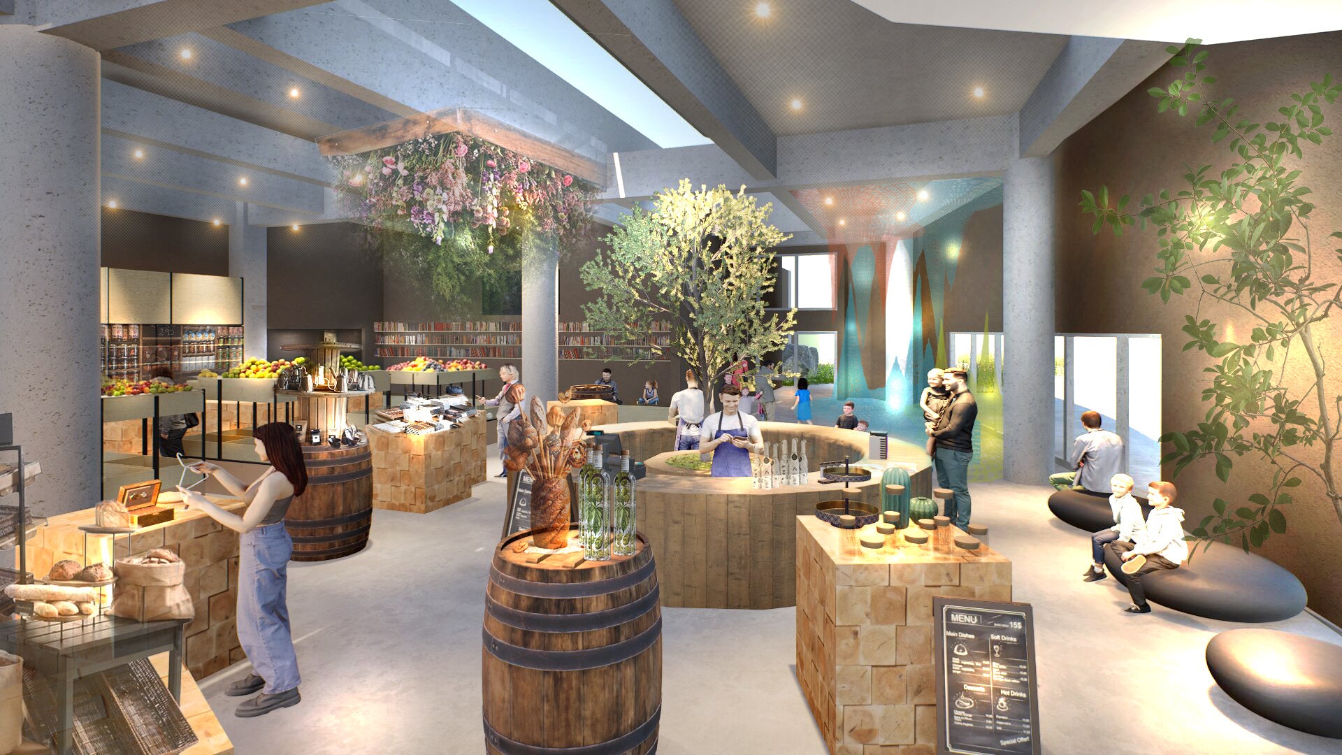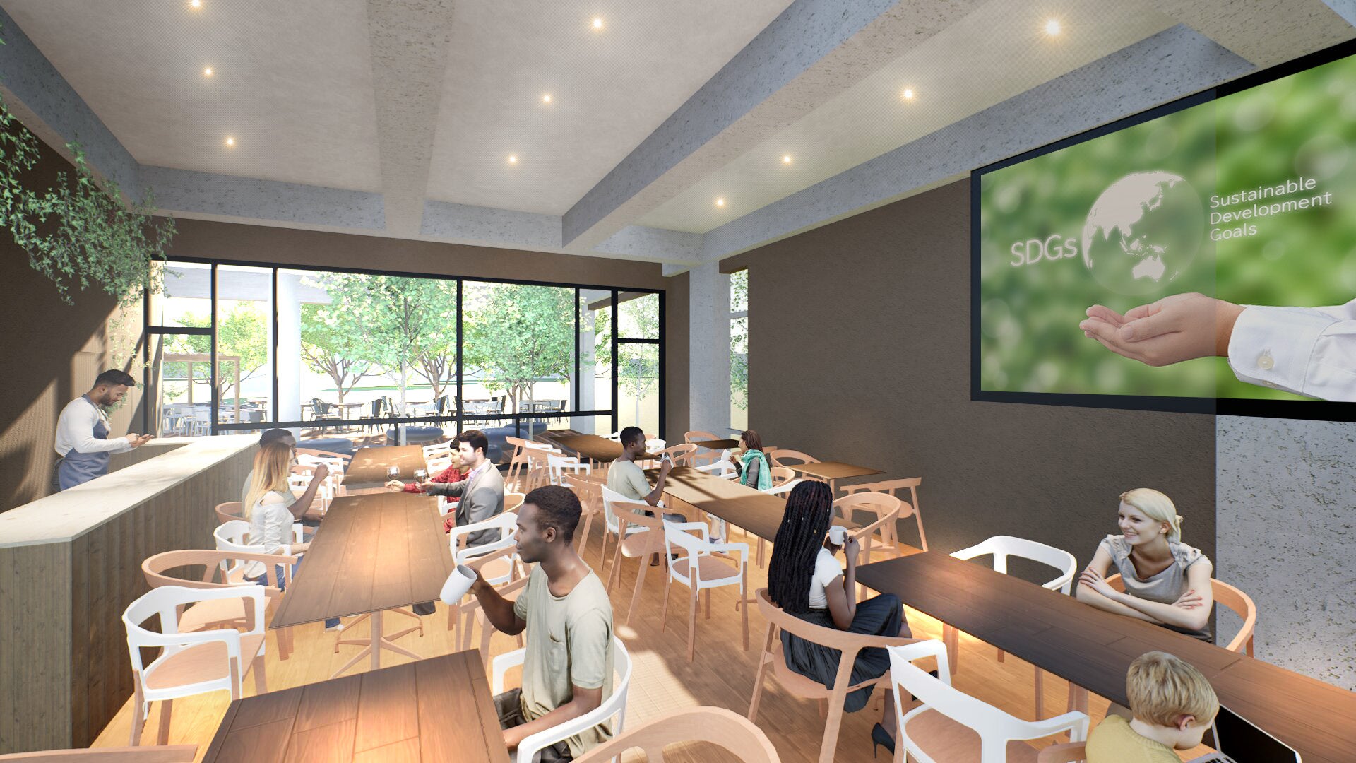 施設内SHOPでは、防災関連のコーナーを設けていますが、ただ防災グッズを展示販売するのではなく、「日常の先にあるもの」として定義し、デザイン性の高い陳列什器を使い、自然との一体感の中で防災対策を訴求していく・・などの取り組みや、コンポストダストボックスを活用した生ごみの再利用でサスティナブルとは何か?を感じていただけると思います。そして、サスティナブル要素を盛り込んだ、施設隣の庭園エリアでは、太陽光パネルを設置し、その場で太陽光エネルギーを使っていただくことができます。地層や泥をテーマにしたオリジナルスイーツやドリンクの開発も、地元企業の皆様と進行中です!ぜひ、オープンを楽しみにしていてくださいね!