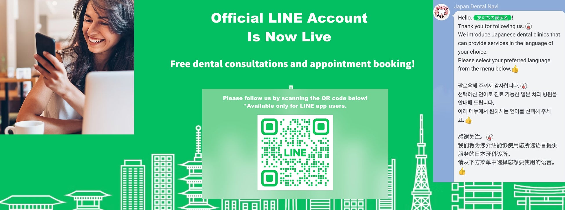 一方、外国人が日本の歯科医院を利用する際には「言葉の壁」「情報の不足」「予約手続きの煩雑さ」などの課題がありました。こうした背景から当社は、外国人の方が安心して歯科医療を受けられる情報基盤と、手厚いサポート体制を構築するため、「Japan Dental Navi」を開発いたしました。