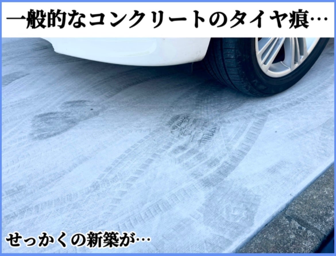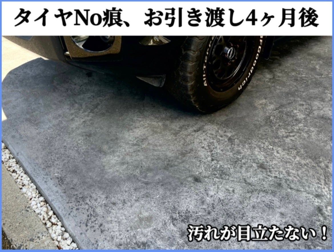 タイヤNo痕とは、「いつまでも美しい床面を」というコンセプトのもとに、関連会社のデザインガーデン株式会社が17年にわたる試行錯誤の末に完成させた独自技術。独特な色味と質感により、タイヤ痕やコンクリートの黒ずみを目立たなくし、デザイン面もコンクリート材でありながら