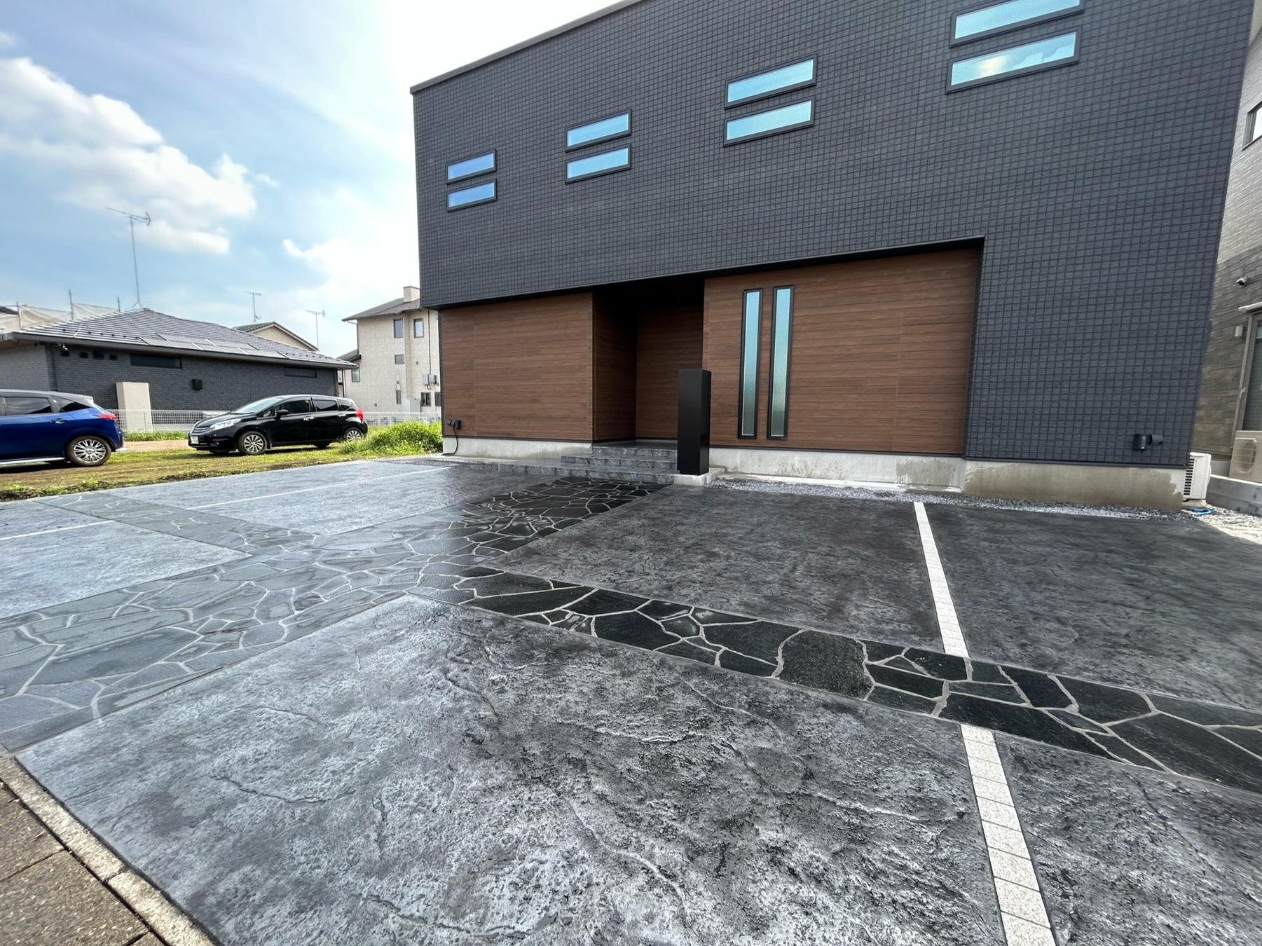 「一味違う印象にしたい!」というような方にも最適です。従来の100万円前後の外構では、全面スタンダードな土間コンクリートが施工されることが大半でしたが、『ラクピカセット』は、タイヤ痕が目立ちにくい“タイヤNo痕”はもちろん、ウッド調の床デザイン等、全面オシャレな色付きのデザイン土間に仕上げることが可能です。