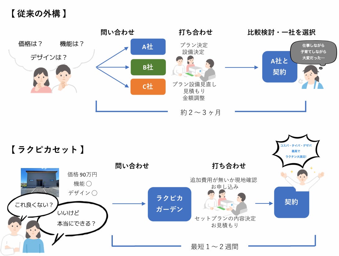また、従来の新築外構では、ご契約までに平均で約2~3か月かかるところ、パッケージ化することにより打ち合わせ時間を短縮。最短1~2週間でのご契約が可能となりました。