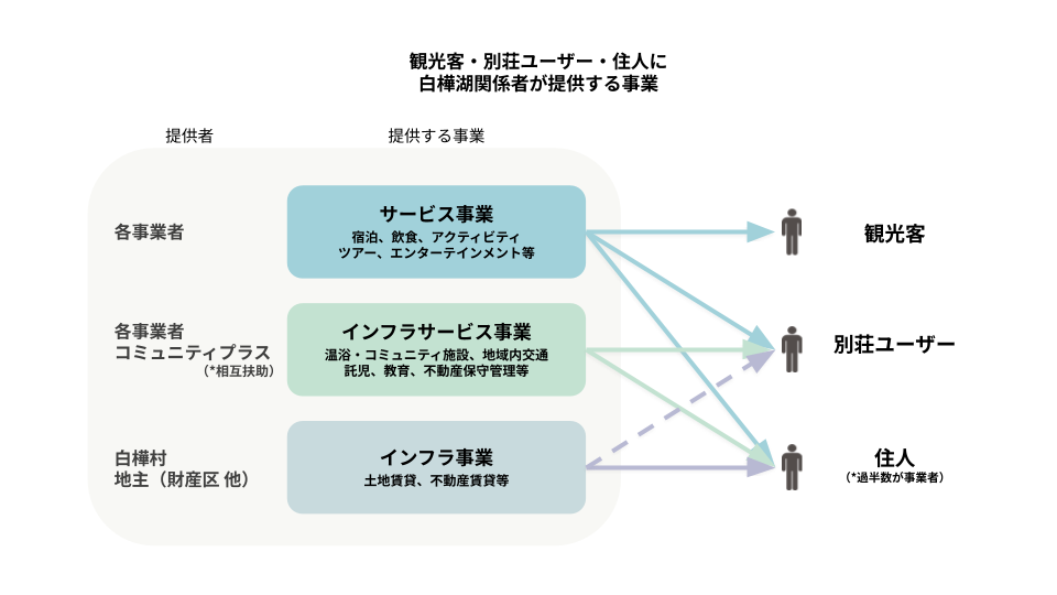 白樺村では、白樺湖に訪れる人々を大きく「観光客」「別荘ユーザー」「住人(=大半が事業者)」の3層で捉え、地域課題をヒアリング・分析してきました。その結果、白樺湖地域が地域として長く続いていくためには、土地や不動産などのハード(インフラ)面と、施設運営や交通、コミュニティ形成といったソフト(インフラサービス)面の両輪での対応が不可欠であると私たちは考えています。