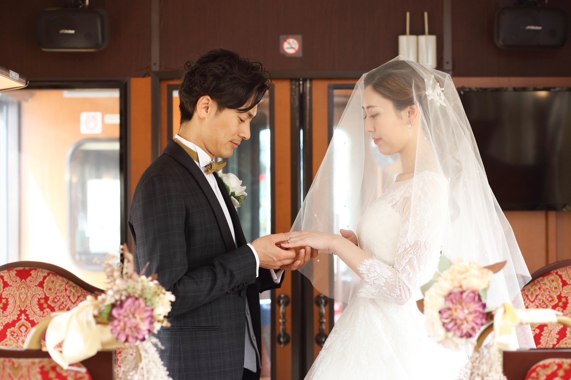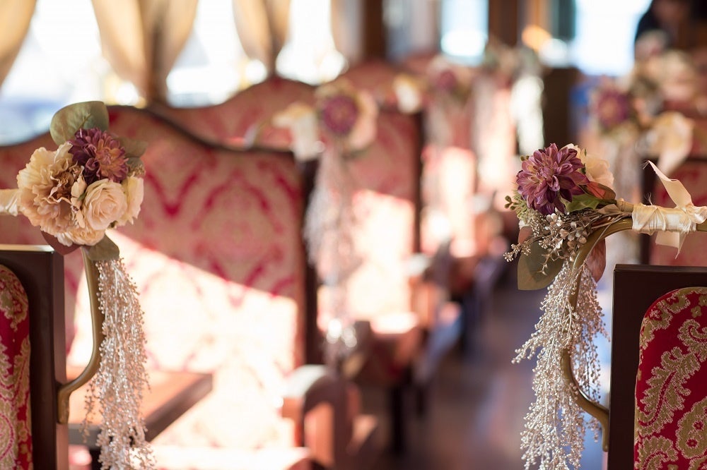・ウェディング仕様の装飾(レトロ列車の内装に合わせた装花を用意)
