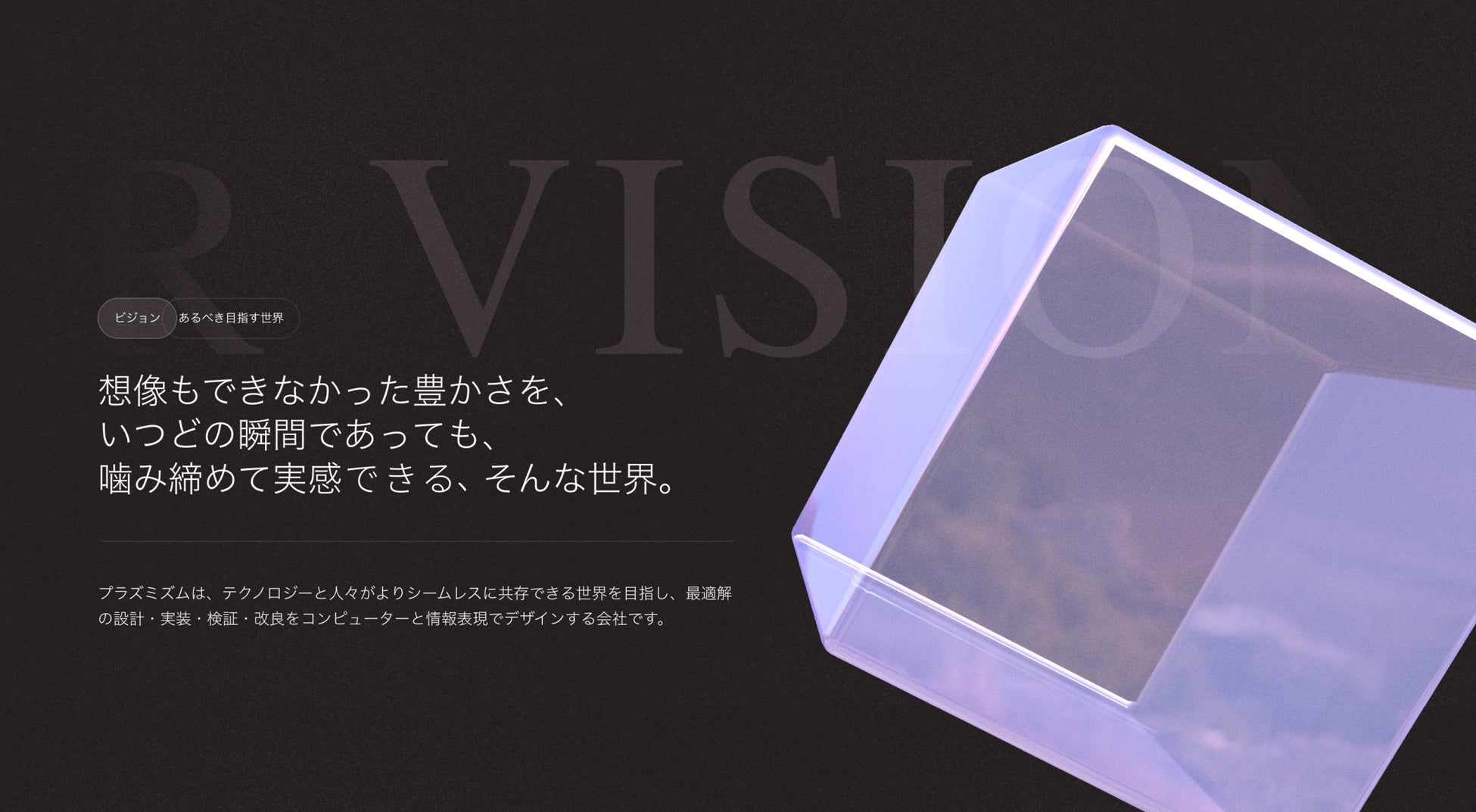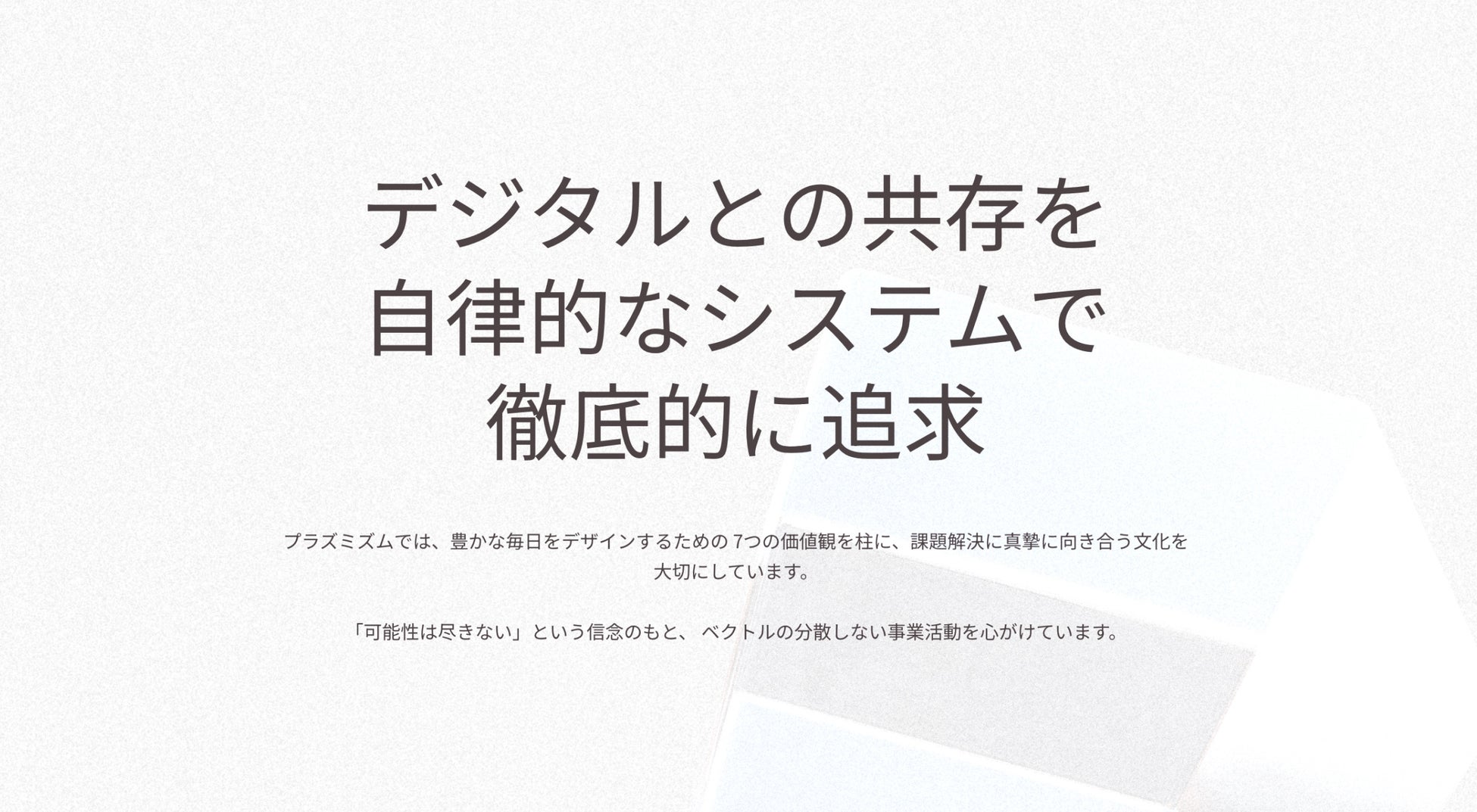 当社は創業以来、「Plasma(プラズマ)+ism(主義)=Plasmism」として、関わる人が今より豊か(より活性化した状態)になれることをモットーに、「リアルとデジタルの融合した文明の新しいカタチが豊かな人間性を創る」というビジョンのもと、Webデザインやグラフィックデザインをメインに事業を展開してまいりました。