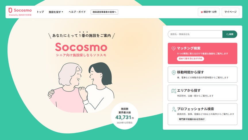 株式会社ソコスモ(代表取締役社長:網谷敏数、以下「ソコスモ」)は、老人ホームマッチングサイト「ソコスモ」(https://www.koureisha-jutaku.com/socosmo)のリニューアルオープンをお知らせします。新しい「ソコスモ」は「ニーズに沿った施設を探しやすく」をコンセプトに、利用者のニーズに合致する施設を迅速かつ正確に見つけられるよう、サイト機能を大幅に強化しました。