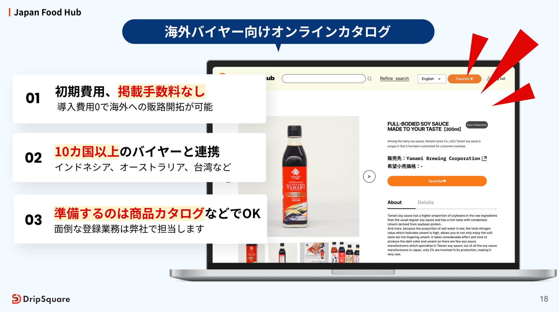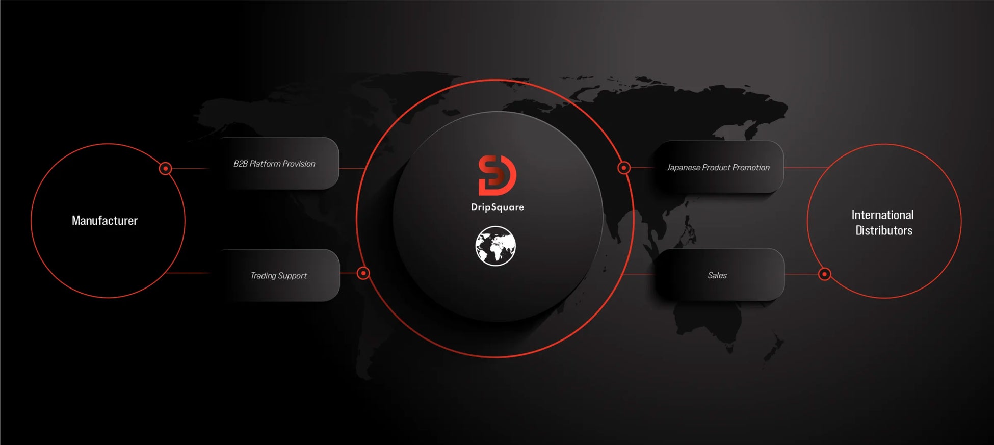 ドリップスクエアは、商社機能をDXで革新し、日本が世界に誇る"食"を軸に中小企業の輸出支援を行っています。国内食品メーカーを中心に、海外販路開拓や越境ECのサポートを提供するクロスボーダー事業を展開しています