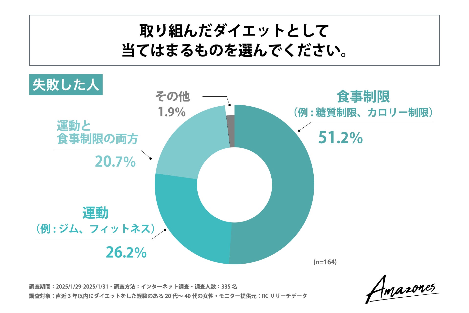 直近3年以内に取り組んだダイエットに失敗した20代~40代の女性の半数は、「食事制限」のみを行っていた