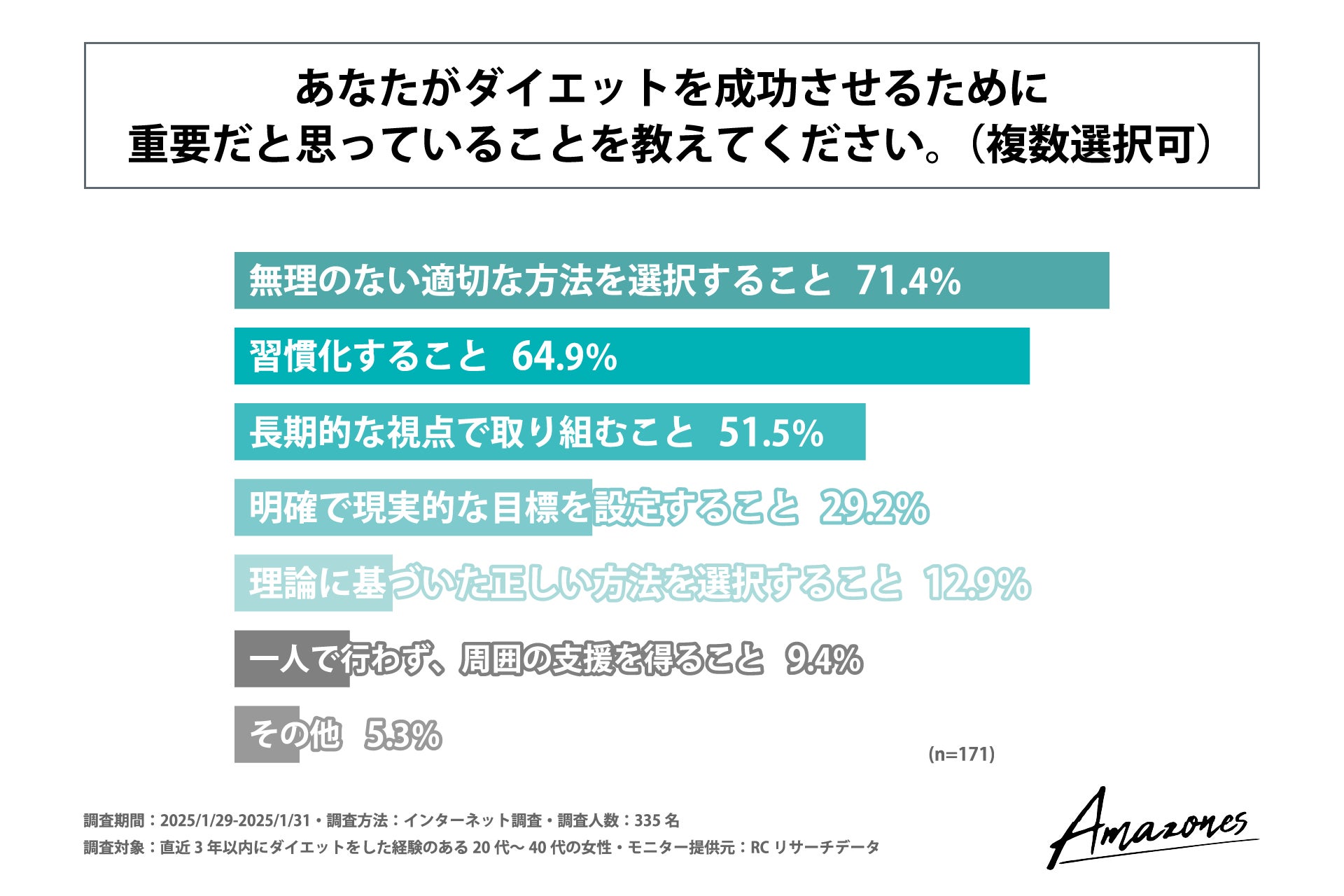 続いて、直近3年以内に取り組んだダイエットに成功したと回答された方に「ダイエットを成功させるために重要だと思っていること」を尋ねる設問への回答では、1位が「無理のない適切な方法を選択すること」で71.4%、2位が「習慣化すること」で64.9%、3位が「長期的な視点で取り組むこと」で51.5%という結果になりました。この結果から、ダイエットを成功させるためには、無理のない方法を選択し、習慣化し続けることが重要だと考えている人が多いことが判明しました。
