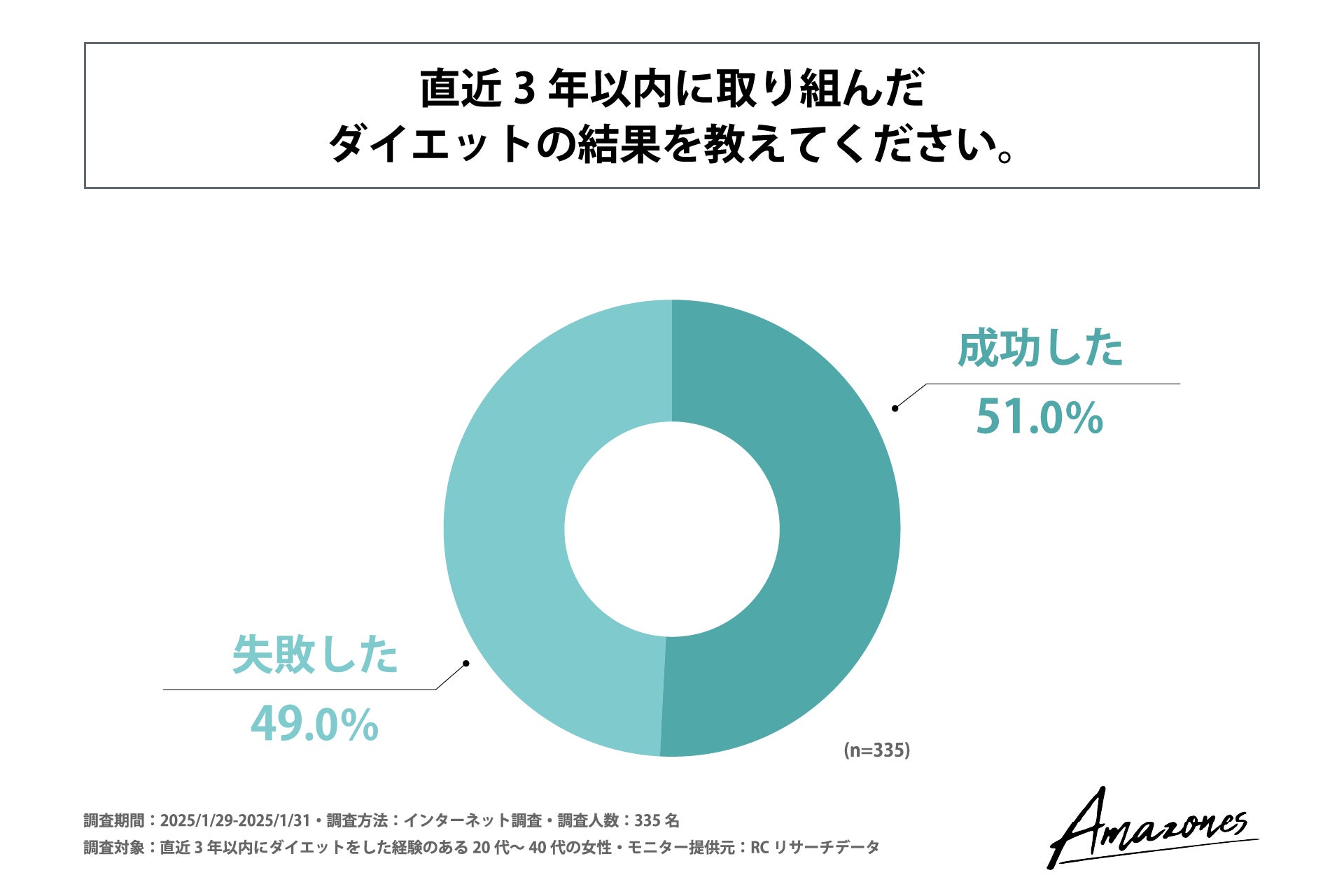 まず、「直近3年以内に取り組んだダイエットの結果」を問う設問への回答では「成功した」が51.0%、「失敗した」が49.0%という結果になりました。この結果から、20代~40代の女性のダイエットの成功率は約50%であることがわかりました。