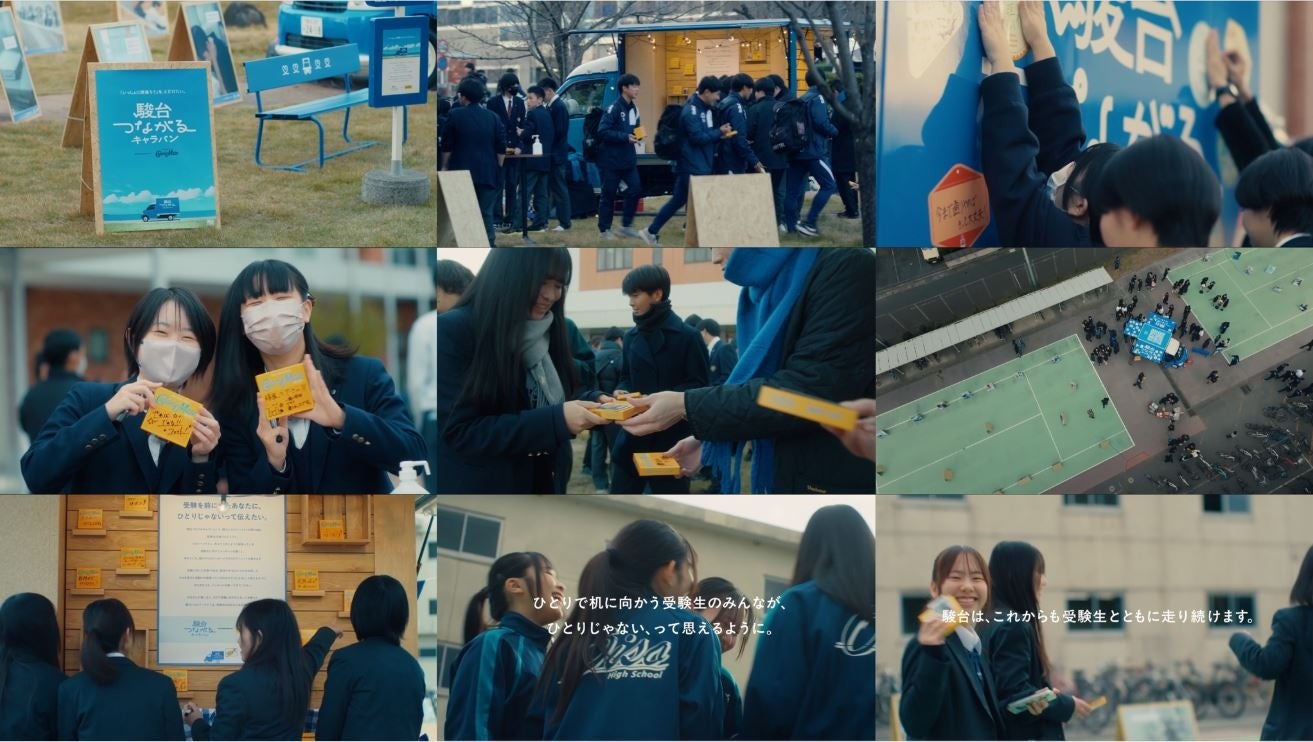 駿台予備学校を運営する学校法人駿河台学園(以下:駿台)は、大塚製薬株式会社(本社:東京都千代田区、以下大塚製薬)のバランス栄養食「カロリーメイト」の協力のもと「駿台つながるキャラバン」を実施しました。駿台カラーの青いワゴンが高校を訪問し、カロリーメイトをバトンに受験生から受験生へメッセージをつないでいく様子を収めたWEBムービーを2025年1月17日に公開します。