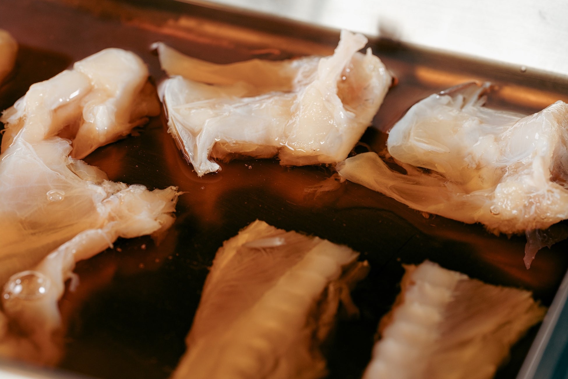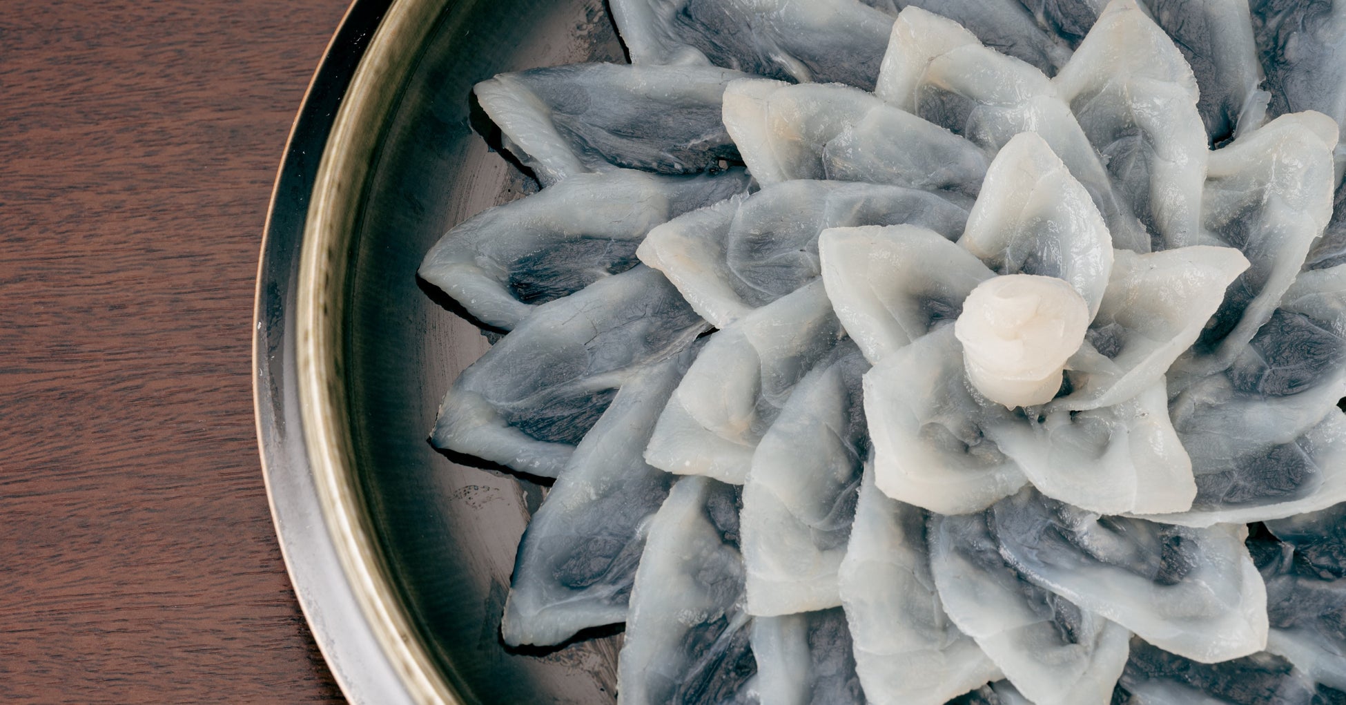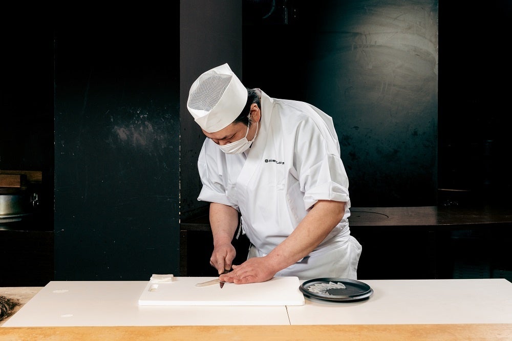 畑水産で丁寧な活かし込みを行い、身欠かれ、選定された質の高いとらふぐは、三日間の熟成期間を経てふくさしの身が完成します。寝かせることで旨味を増していくふぐの身。成熟したふくの旨味としっかりとした食感を大切に、調理人がやや厚めに引いていきます。