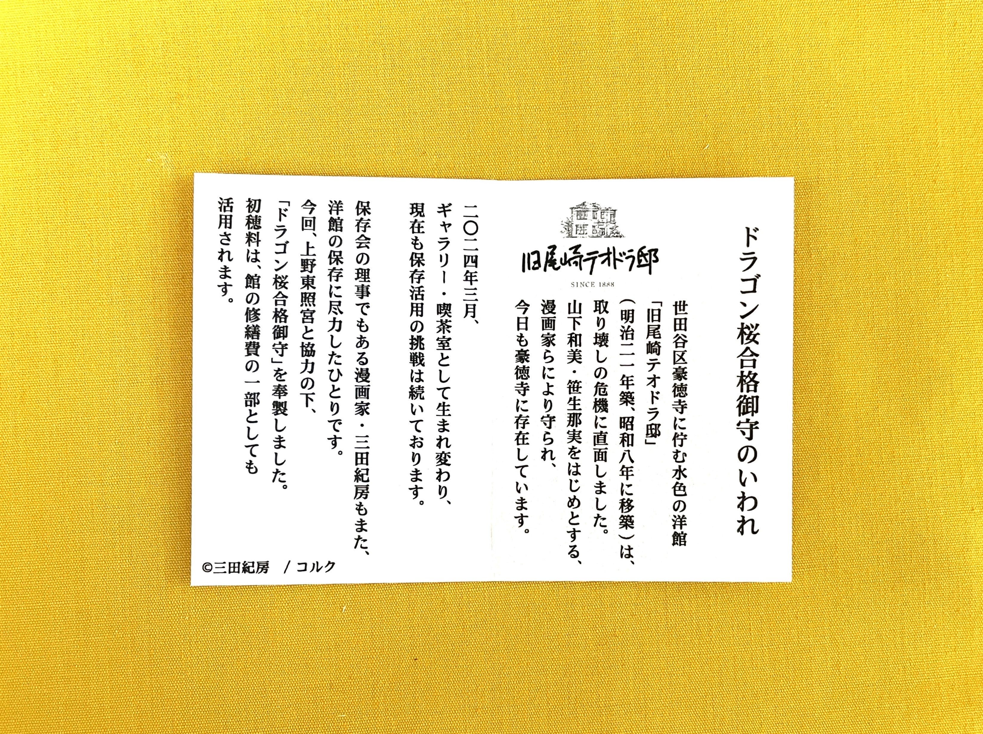 「ドラゴン桜」作者の三田紀房氏は世田谷区豪徳寺にある明治時代の洋館「旧尾崎テオドラ邸」保存会の理事を務めており、その活動に賛同する上野東照宮が御守1体につき300円を寄付することにより、御守の初穂料の一部が洋館の修繕費として活用される。 12月14日はこの洋館ゆかりの尾崎テオドラ英子(1870年~1932年)(東京市長・尾崎行雄の妻)の誕生日。