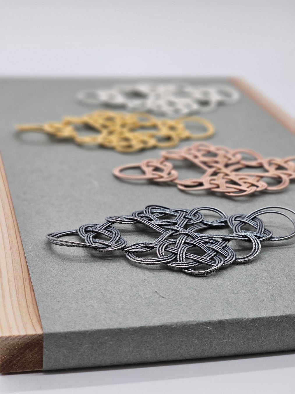 チェーンメーカー山森の新マシンチェーンとして、ビロードチェーンを発表。山森の真骨頂である輝きと滑らかさに拘ったまるでシルクのようなチェーンですので、是非手に取ってみて頂きたいと思います。その他、上品な輝きのワイヤーを形状記憶のリングやブレスレットとなったTwinkle(トゥインクル)シリーズ、山森製鎖が自信と覚悟をもってChallengeしたほかで見ることのないジュエリーの数々が並びますので、是非山森のブースへお立ち寄りください。
